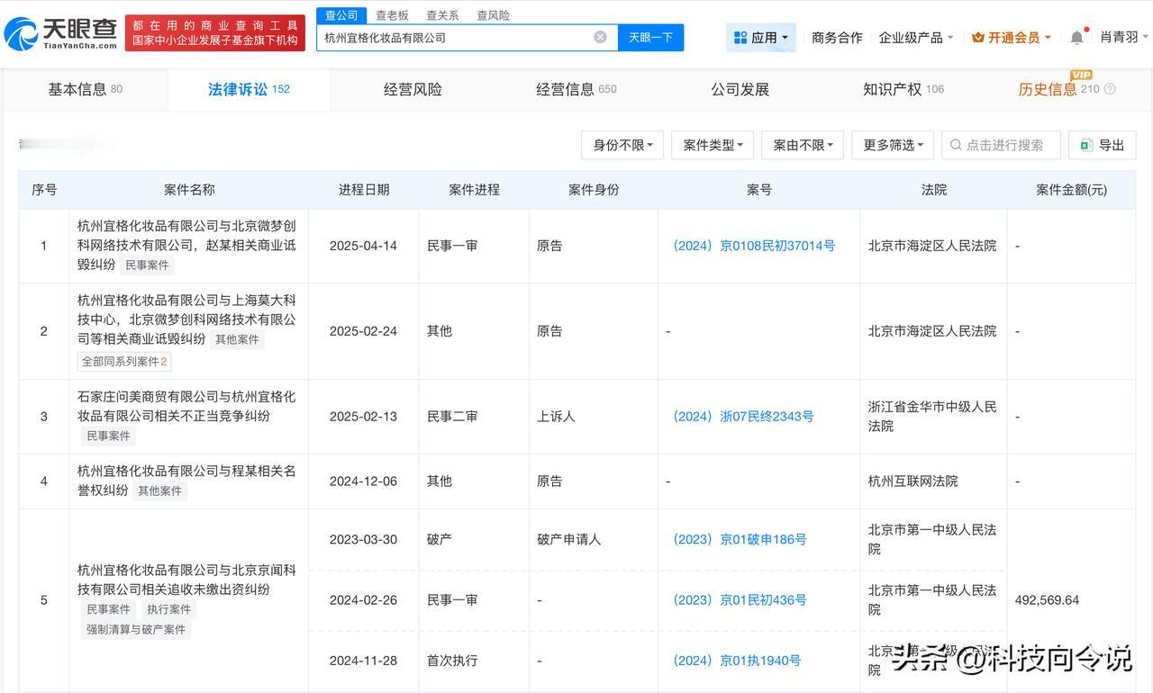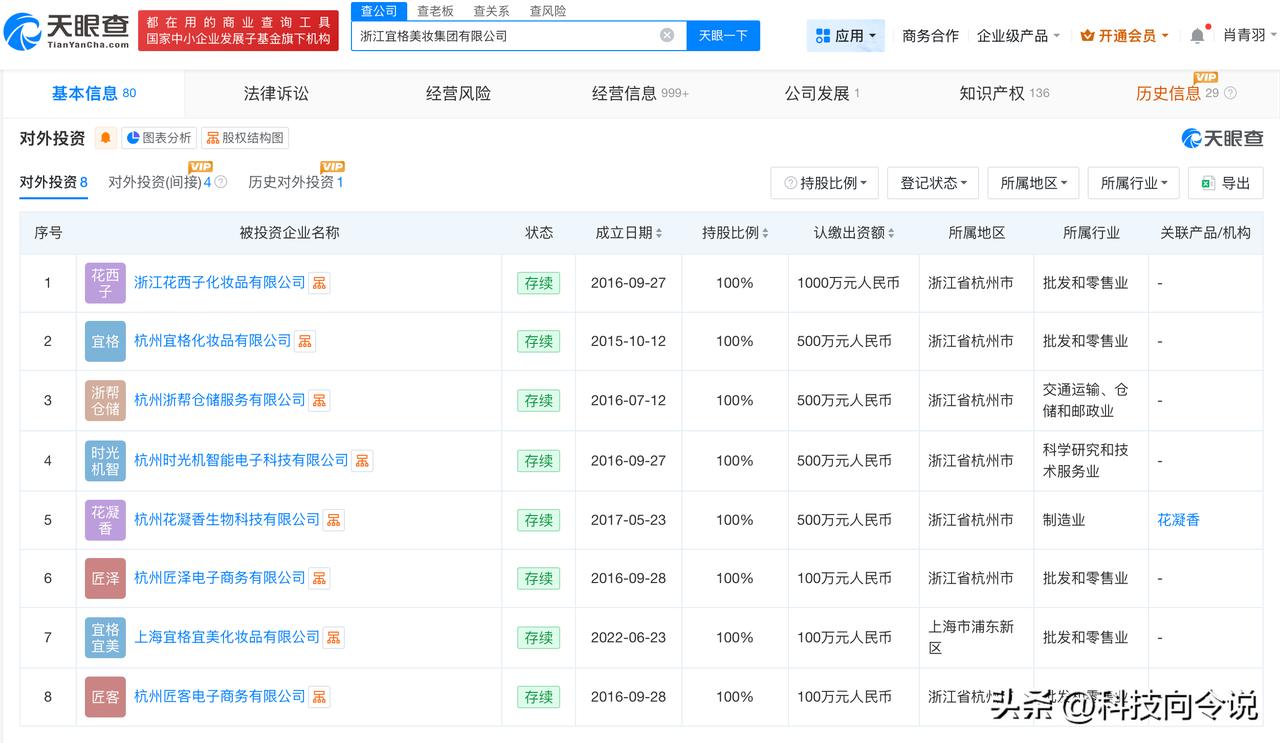 【花西子旗下公司曾因成分表述不准确被罚】花西子下架陷苏丹红争议底霜 据媒体报道,10月23日,陷入争议的花西子桃娇鲜颜精华底霜已从品牌官方旗舰店下架。此前,第三方测评机构发布视频称,包含花西子在内的多个品牌化妆品被检出含有苏丹红成分。 天眼查App显示,花西子关联公司杭州花凝香生物科技有限公司成立于2017年5月,法定代表人为张大勇,注册资本500万人民币,由浙江宜格美妆集团有限公司全资持股。对外投资信息显示,该公司持有4家企业股份。 浙江宜格美妆集团有限公司成立于2021年11月,注册资本约5154.6万人民币,由宜格国际投资发展(海南)有限公司全资持股。对外投资信息显示,该公司全资持股杭州宜格化妆品有限公司、杭州匠泽电子商务有限公司等8家公司。值得注意的是,天眼风险信息显示,杭州宜格化妆品有限公司涉及多个法律诉讼,案由包括侵害商标权纠纷、网络侵权责任纠纷、商业诋毁纠纷、名誉权纠纷等。 此外,今年1月,杭州匠泽电子商务有限公司曾因在其线上店铺发布的三款化妆品广告中对商品的性能、成分表述不准确,被杭州市钱塘区市场监督管理局罚款3万元。 天眼查信息:
