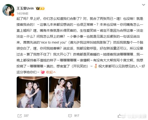 王玉雯被刘亦菲搂刘亦菲先跟王玉雯说的话神仙同框太治愈!刘亦菲主动先搭话,随后亲昵搂肩,王玉雯笑容腼腆,氛围超和谐。