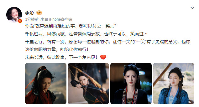 李沁告别一笑随歌,谁懂我们李沁付一笑告别啦,是很精彩的角色设定,付一笑的飒爽和打戏的身段真的很带感,我们永远期待和李沁的下个角色再见啦~
