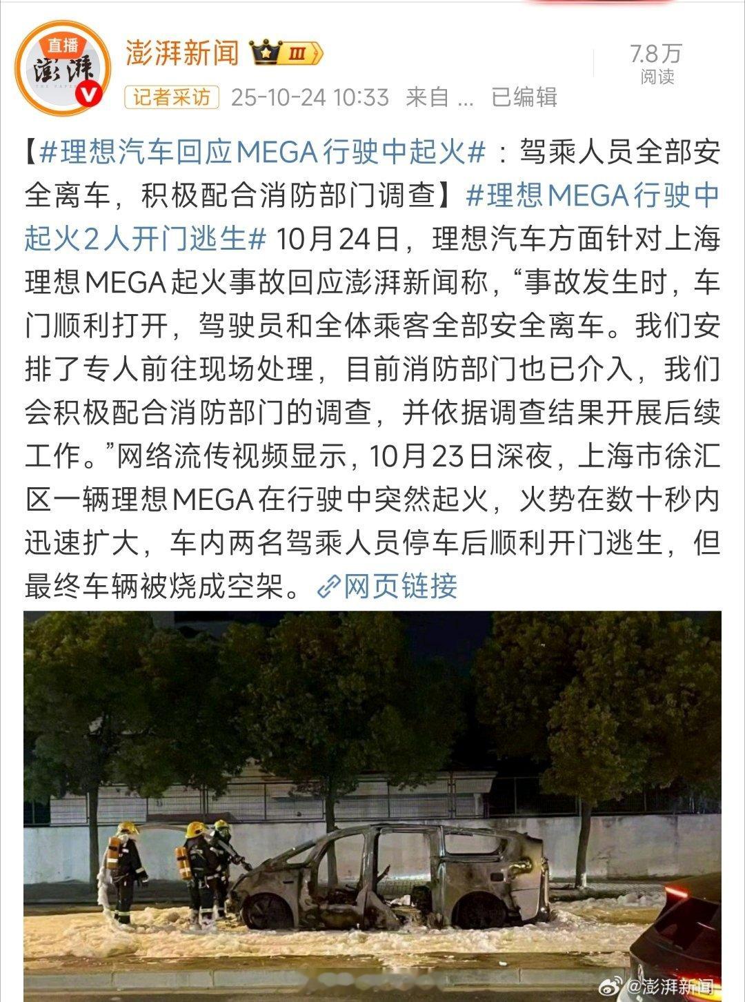 理想mega行驶中无碰撞突发大火,车被烧得只剩空架,好在人及时逃出来了。到底啥原因?坐等官方调查结果。