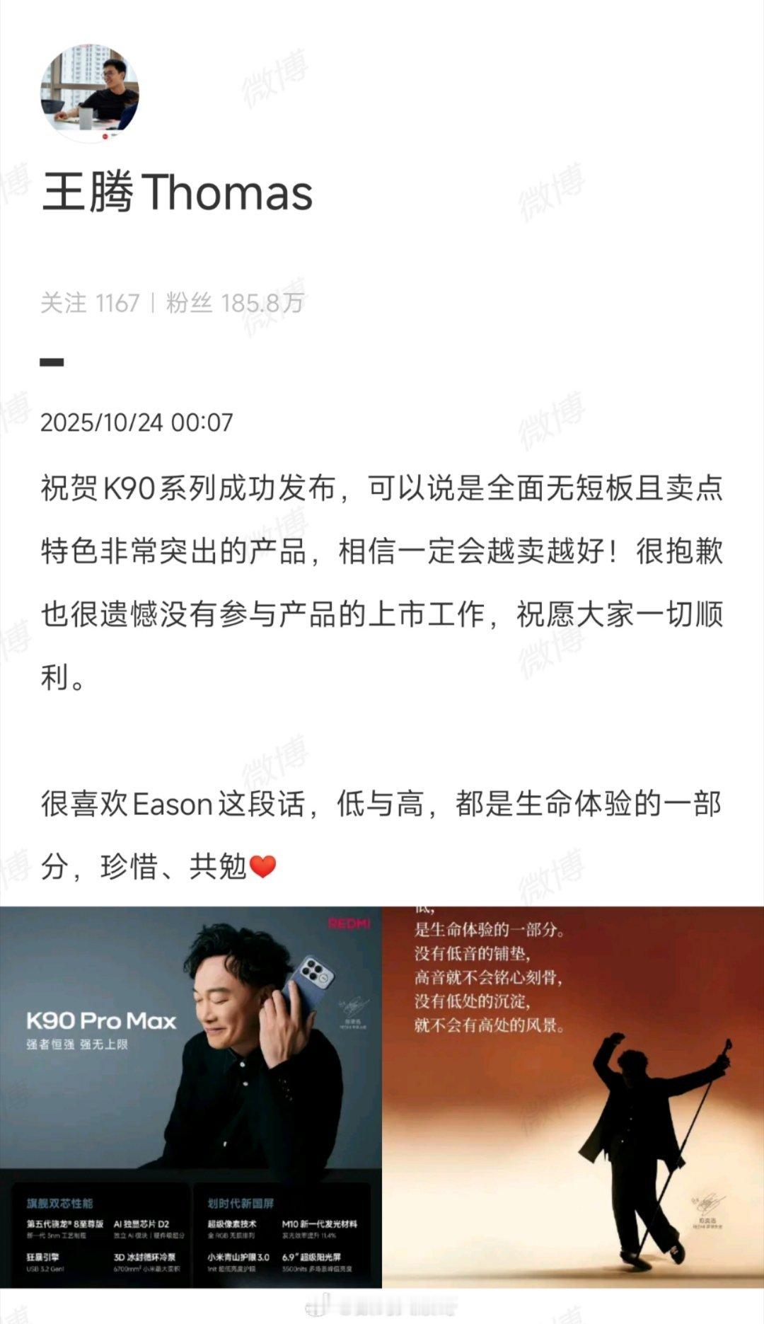 王腾发文致歉,直言没能参与K90产品上市工作满心遗憾,字里行间满是不舍,让不少关注者跟着惋惜~