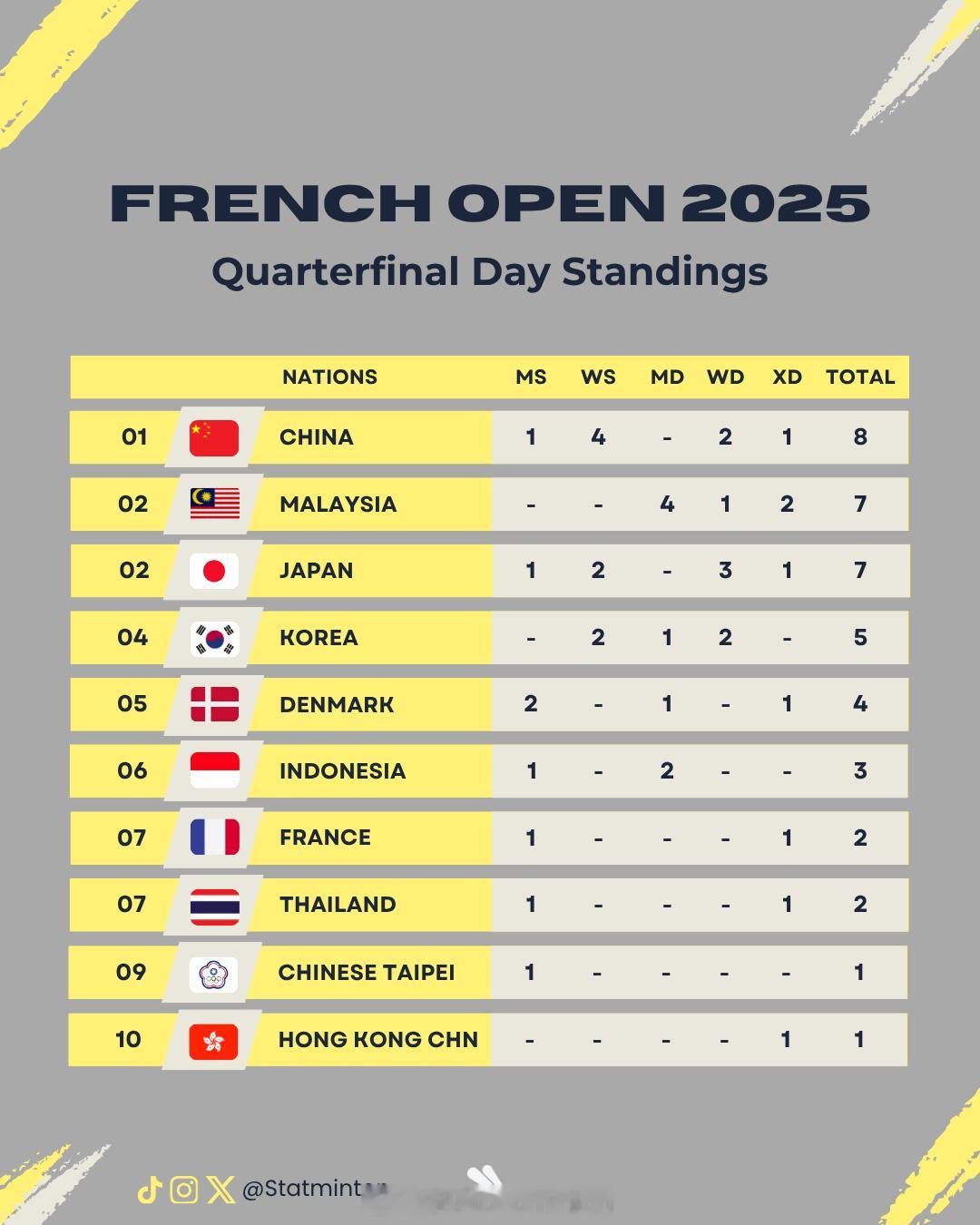 🇨🇳中国队以8席八强(图1)【仅男双缺席】位居第一!