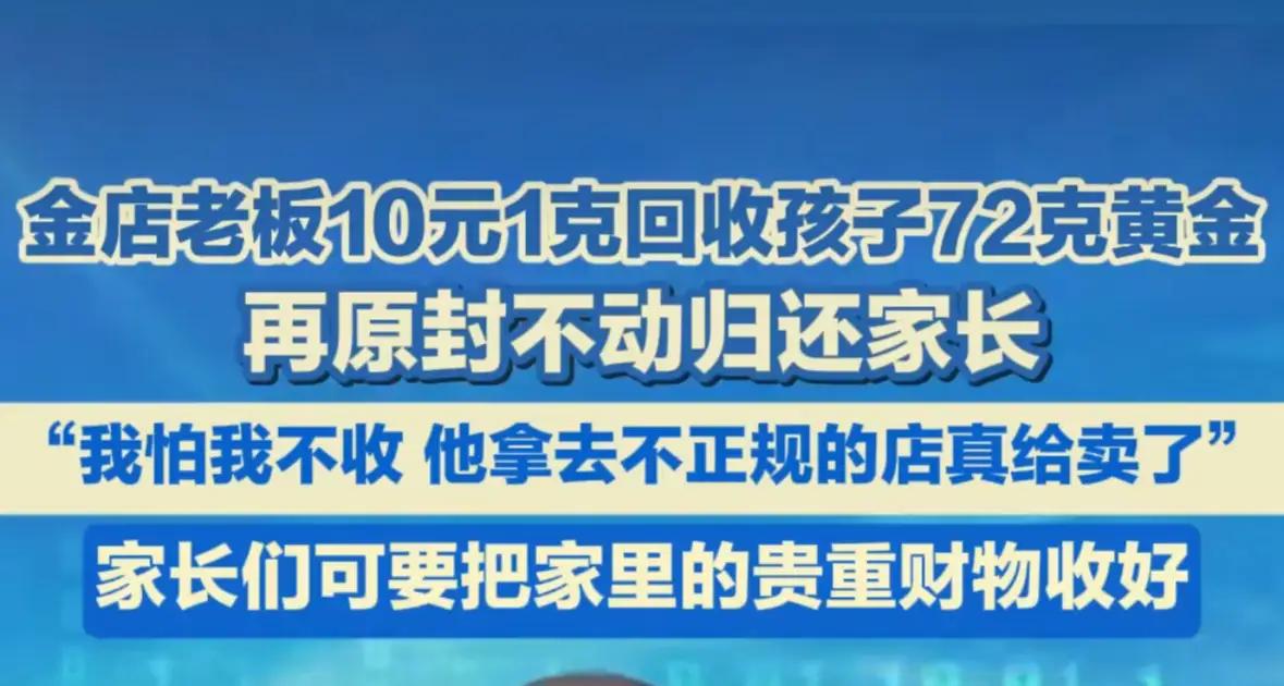 近日,四川雅安,一位金店老板,以10元每克的价格,回收了一个孩子72克黄金。 一个14岁男孩拿着72克金饰进店售卖,说这是妈妈去年送的礼物。老板一瞅钢印,这金饰都出厂十六七年了,当场就觉出不对劲。 他没直接拒也没报警,反而掏出720块,以10元一克的价格“收”了下来。这价格连市价的零头都不到,就是为了稳住东西。 老板事后说,真怕不收,孩子不懂价,转头就卖给黑作坊熔了,七万多的东西就彻底没了。 他立马拍视频发网上,又把消息转到十几个业主群,还报了警。没半天,孩子家长就急急忙忙找来了。 金饰原封不动还回去,只收回自己垫的720块。网友都夸:这收的是责任,还的是比黄金金贵的温度!必须给老板点个大赞!