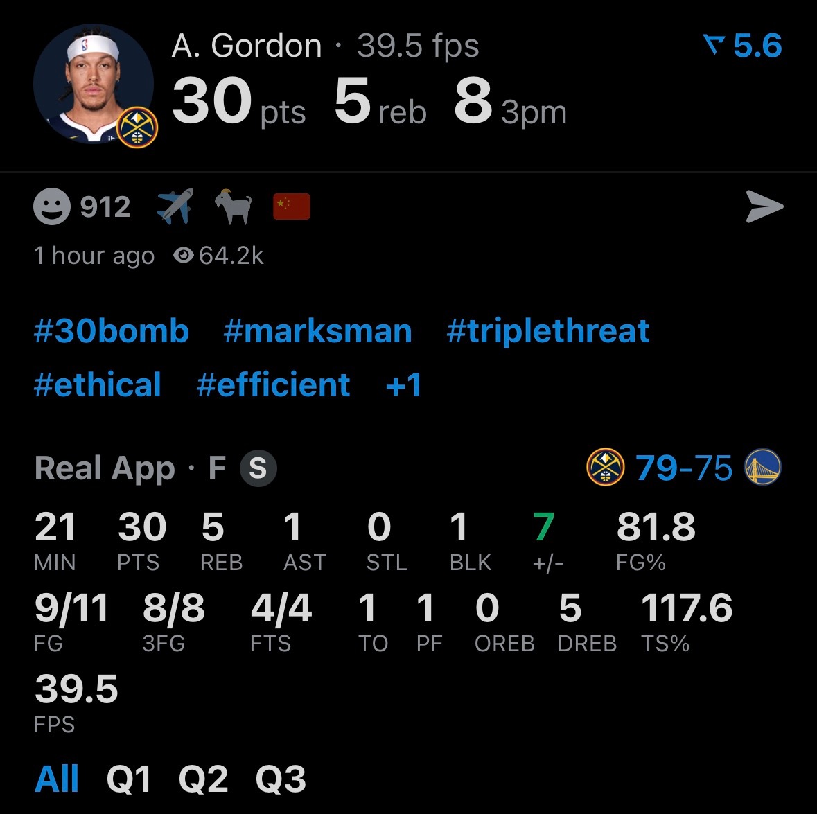 全场结束,掘金131-137勇士。戈登50分8篮板2助攻,三分球11中10。约基