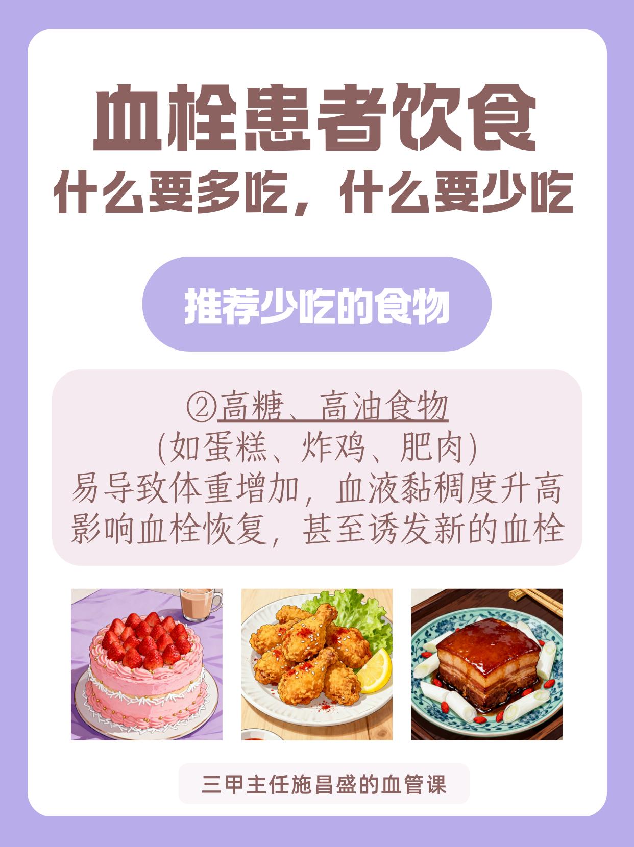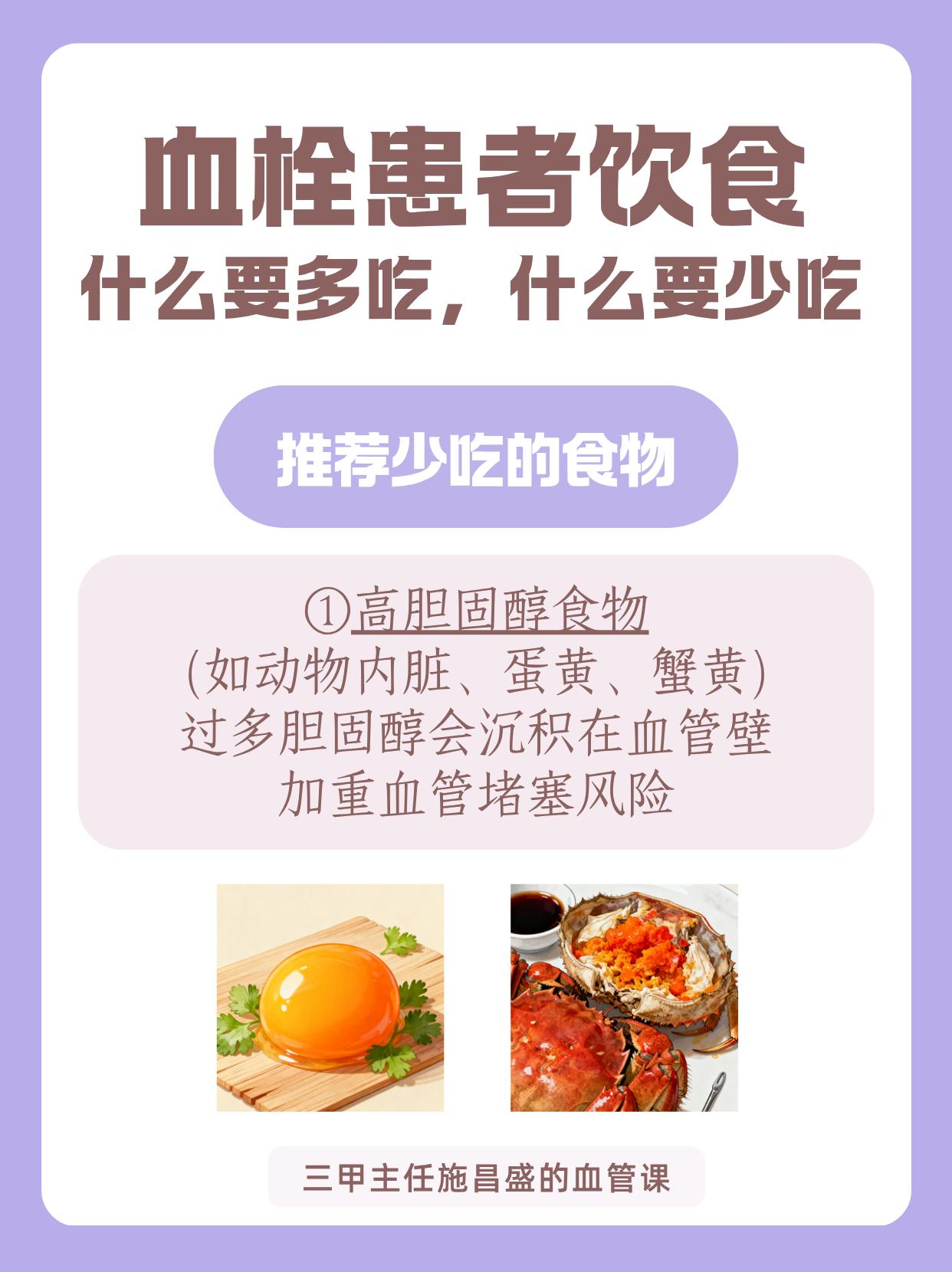 血栓患者饮食:什么要多吃,什么要少吃。血栓患者饮食调理很关键:多吃含Omega-3的鱼、核桃,维C的果蔬及膳食纤维食物,辅助改善病情;少吃高胆固醇(如内脏、蛋黄)和高糖高油食物(如蛋糕、炸鸡),以防加重血管负担,诱发新血栓。