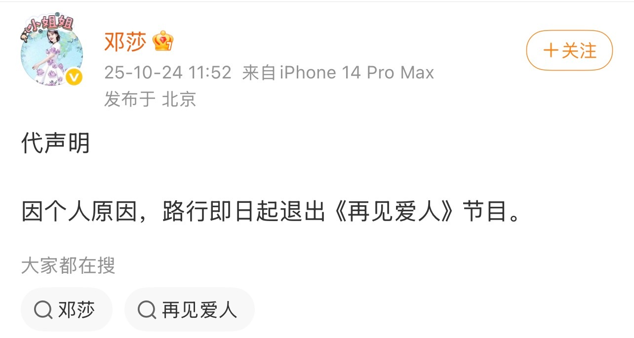 路行退出再见爱人5邓莎通过个人社交媒体发布声明确定,路行退出了《再见爱人》节目,这是该节目五季以来首次出现此类情况。路行此前因个人行贿行为被网友扒出,引发舆论争议。