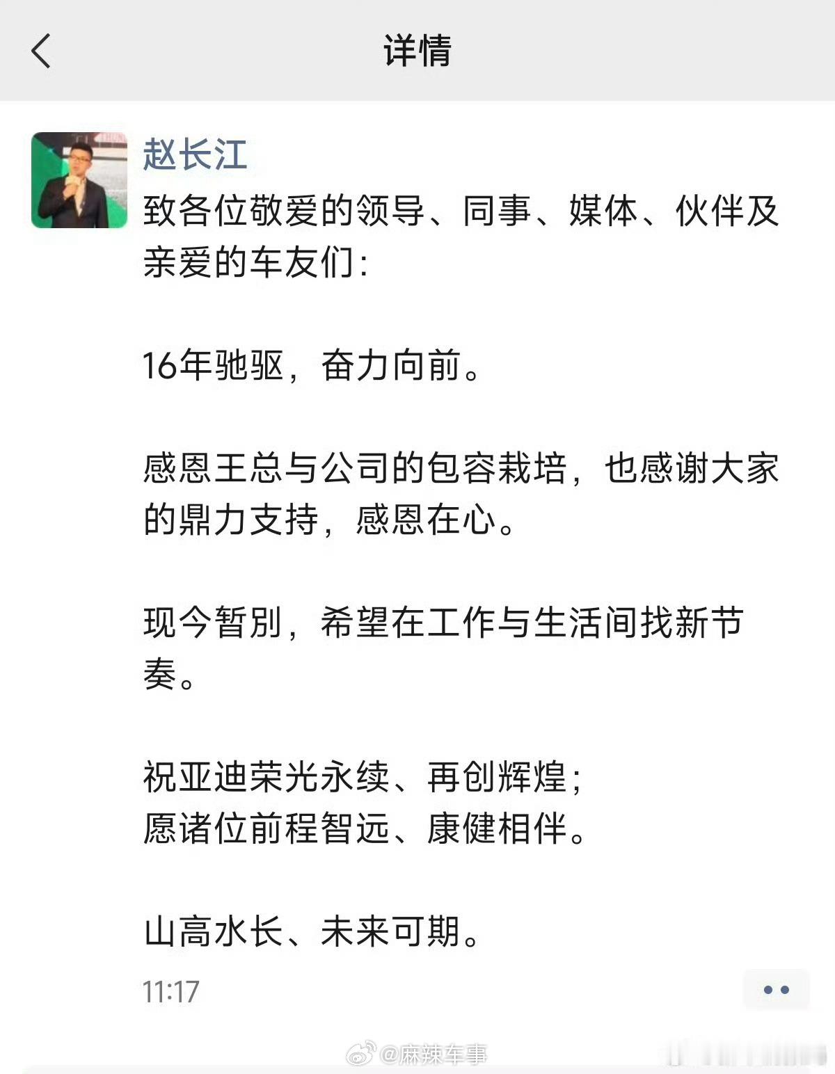 比亚迪赵长江称将暂别比亚迪赵长江官宣离职 10月24日,比亚迪赵长江朋友圈发文称:16年驰驱,奋力向前。感恩王总与公司的包容栽培,也感谢大家的鼎力支持,感恩在心。现今暂別,希望在工作与生活间找新节奏。