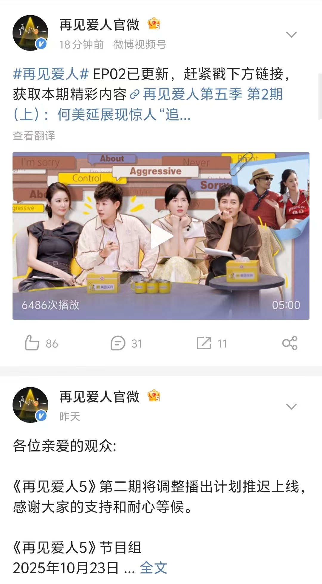 【路行退出再见爱人节目】哎?今天中午突然发了一则代声明:“因个人原因,路行即日起退出《再见爱人》节目。 ”昨日,《再见爱人5》节目组宣布第二期将调整播出计划推迟上线,24日中午,节目第二期已正式上线。