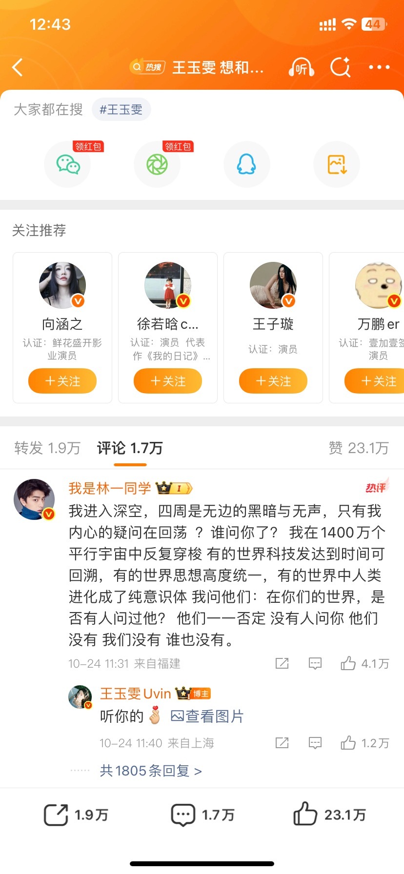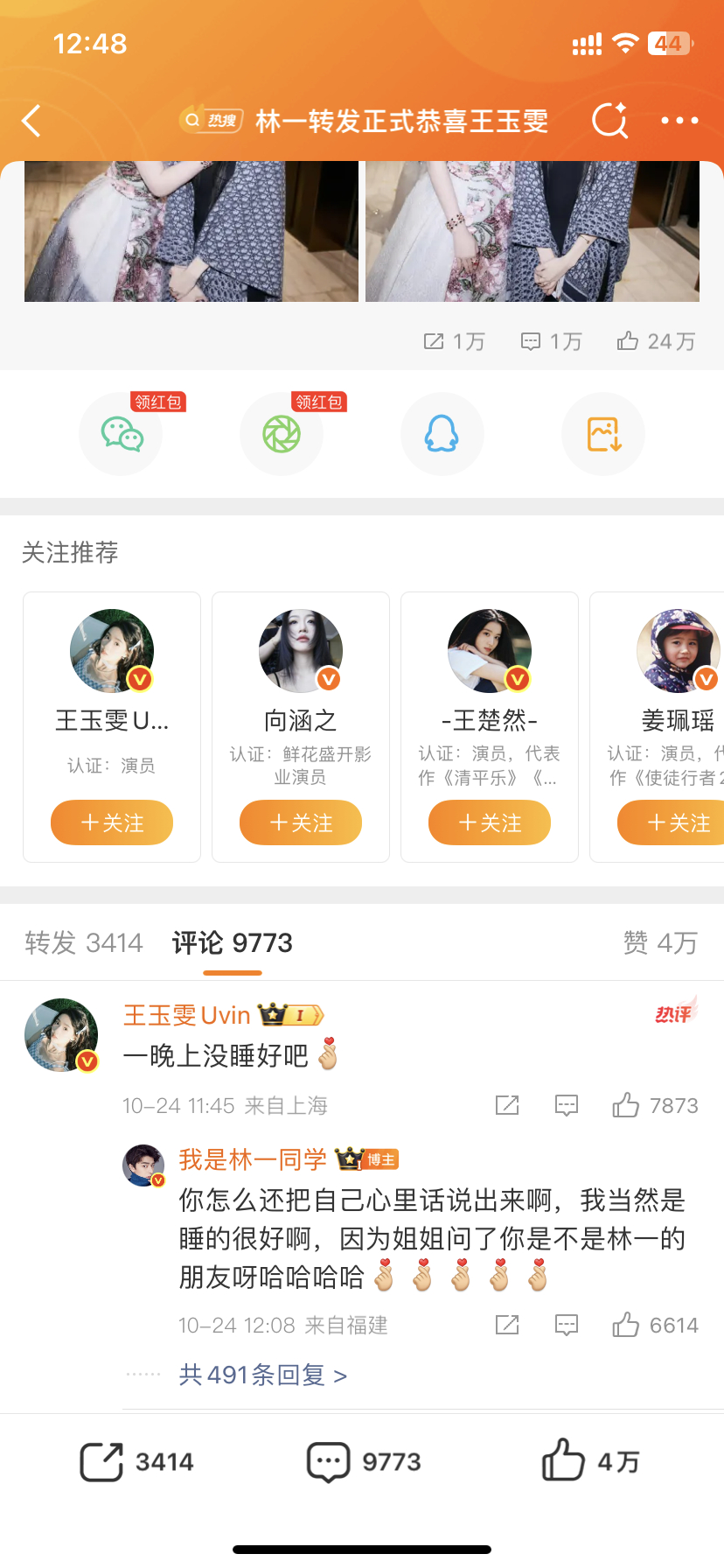 王玉雯 想和刘亦菲官宣了林一转发正式恭喜王玉雯