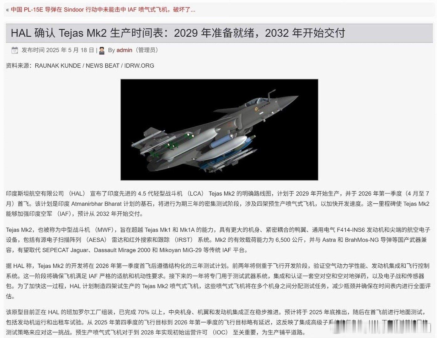 ➡️LCA MK2 经过四次迭代,MTOW不断提高,目前其最大起飞重量达到17.5吨,但用F414的LCA MK2爬升率仍然不如用F404的鹰狮,暗示LCA MK2存在超重问题。预计2026年首飞、“将”在2029年IOC,“将”在2032年交付印度空军。