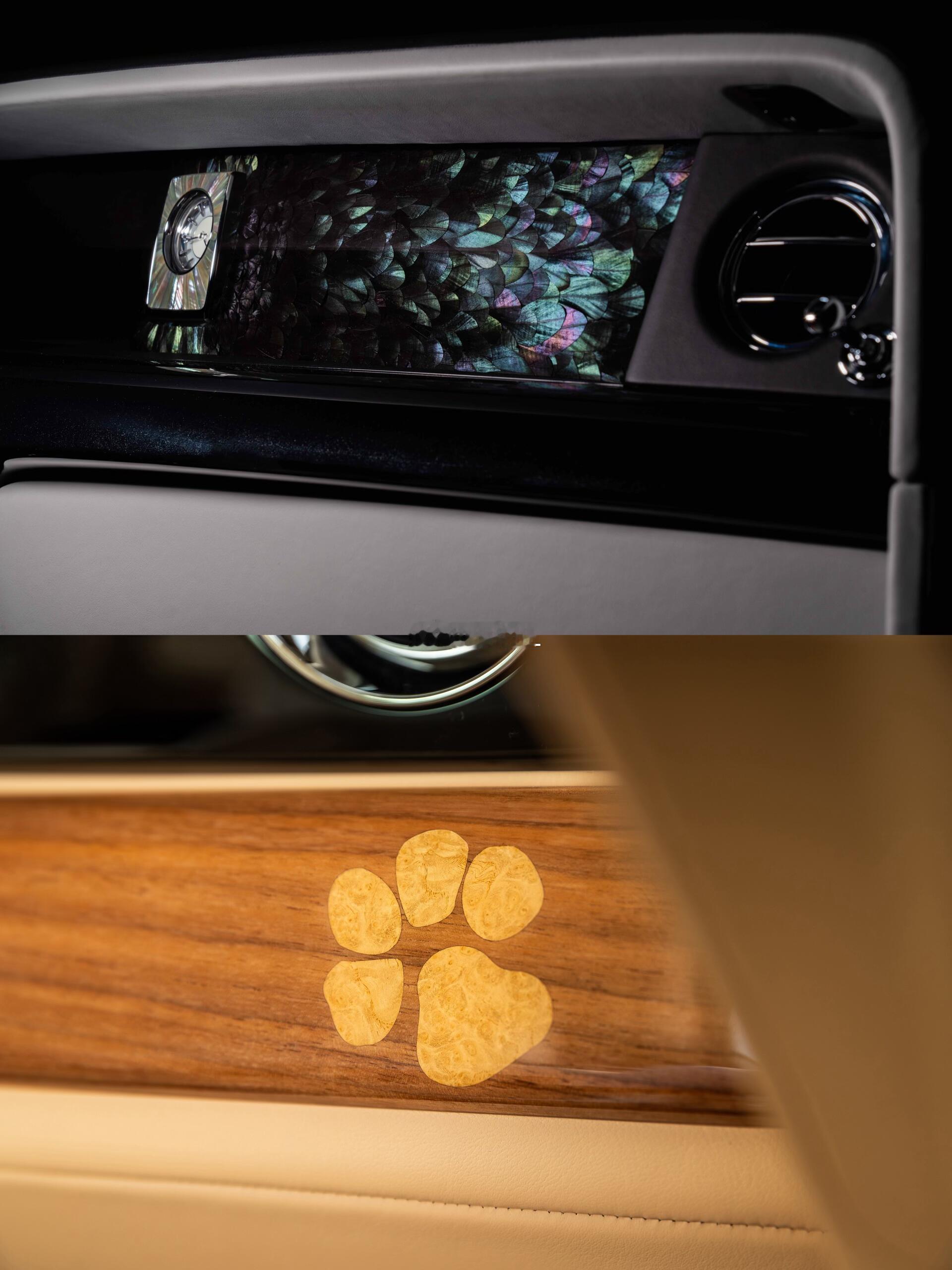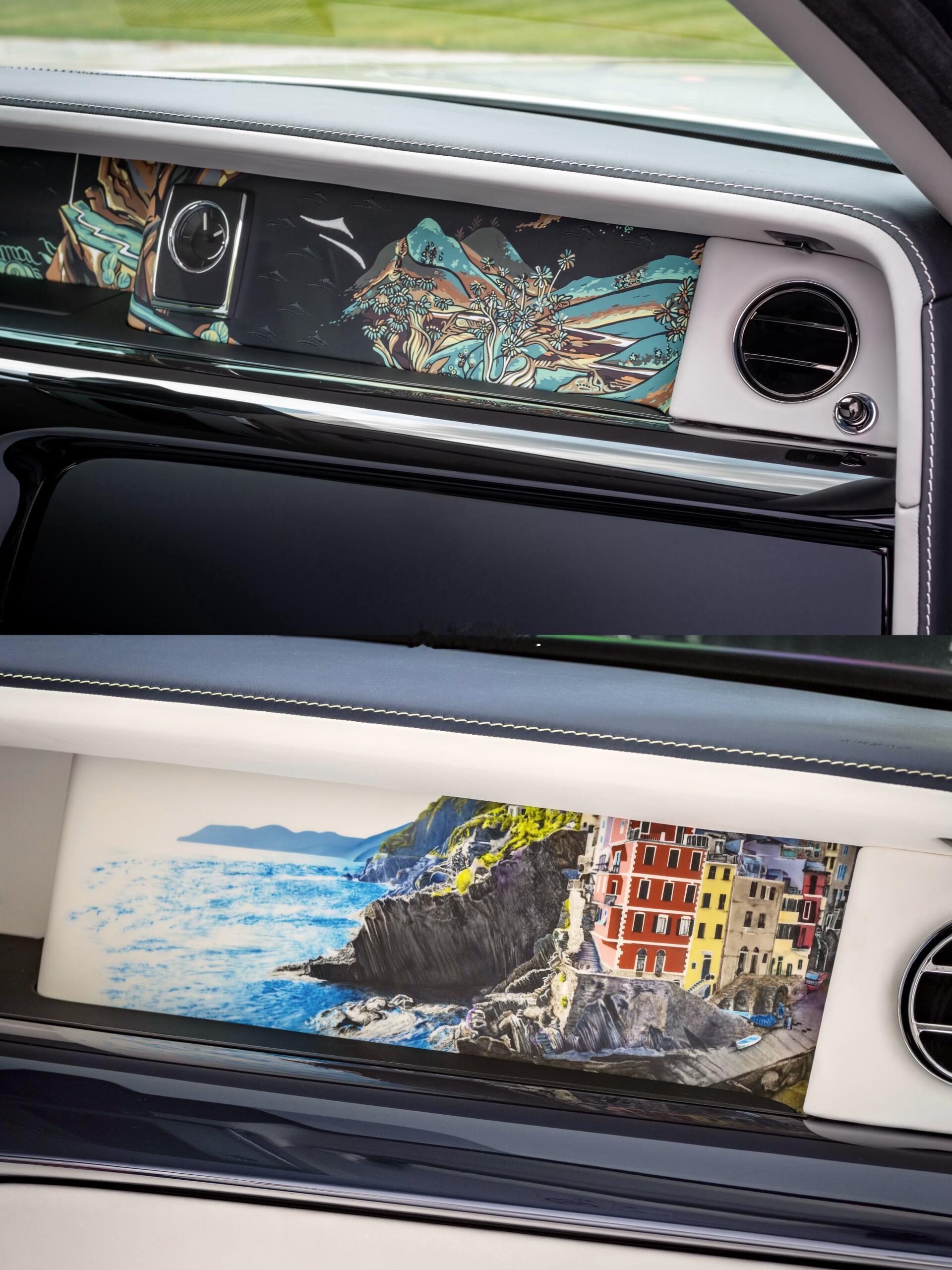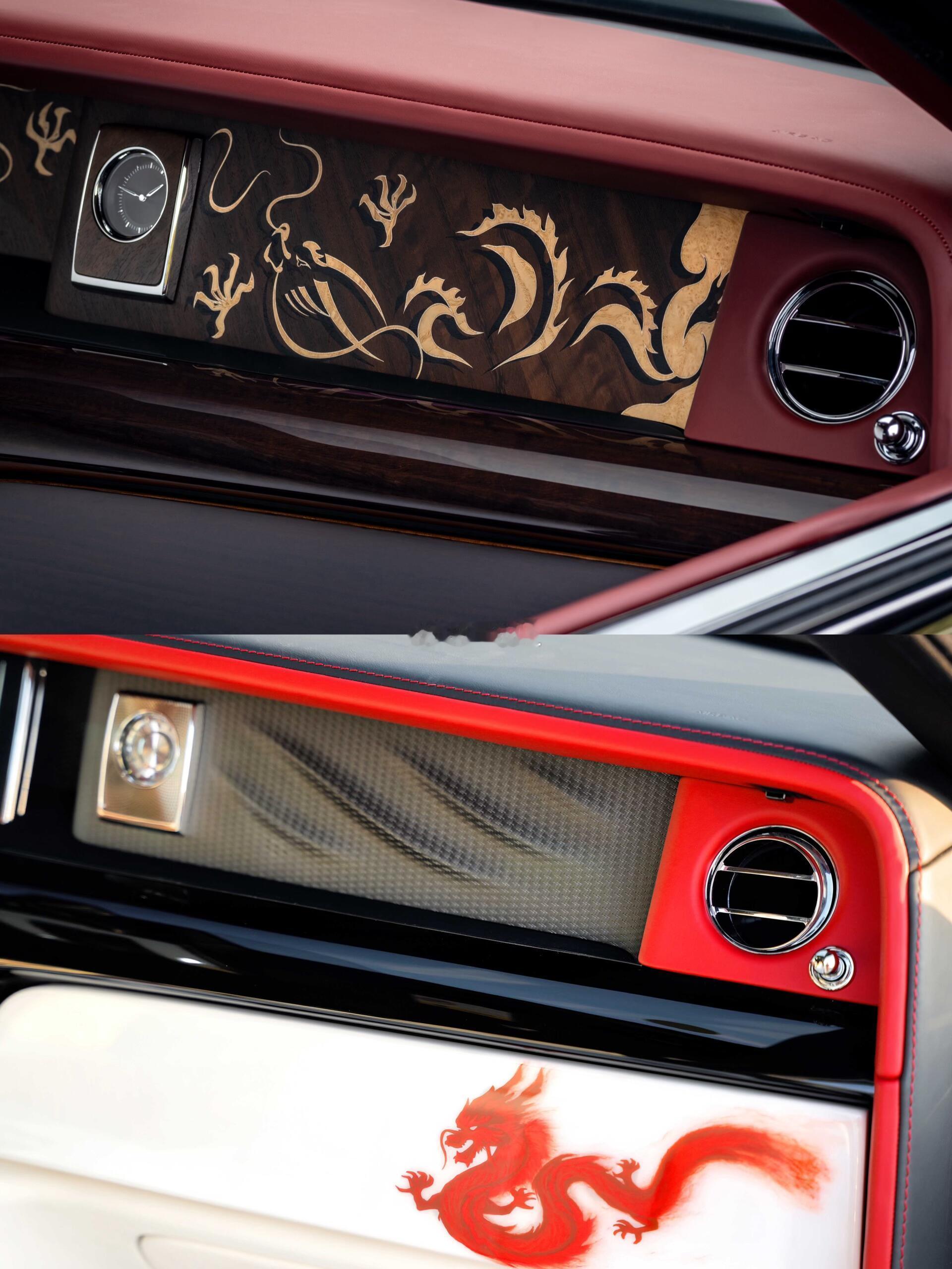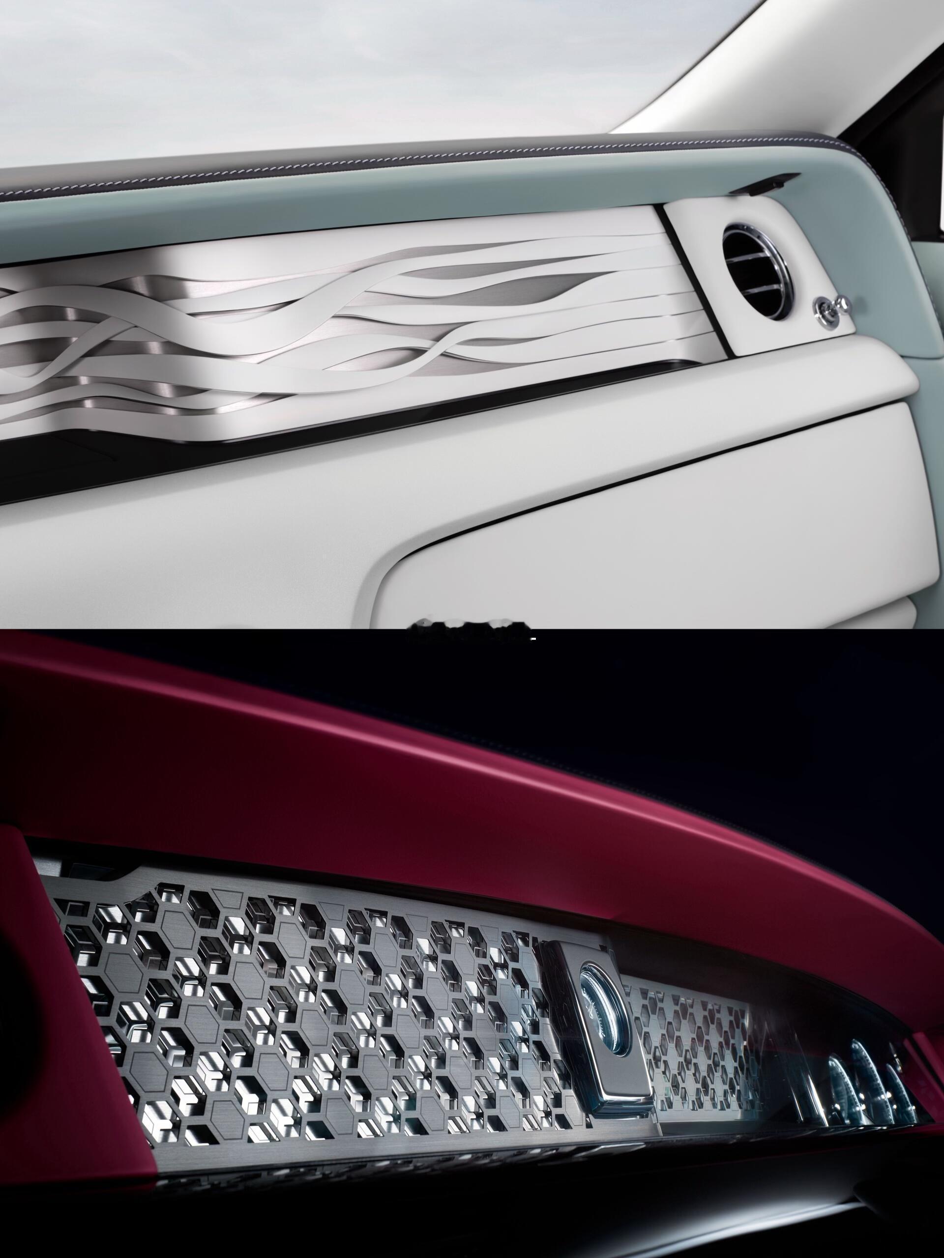 劳斯莱斯的各种花式中控台设计,尤其是副驾位置,做一些个性化设计,有绘制油画的,有绘制抽象图案的,有做抽象工艺的,有绣花的,有搞一幅地图的,有雕刻的,有印狗爪的……劳斯莱斯