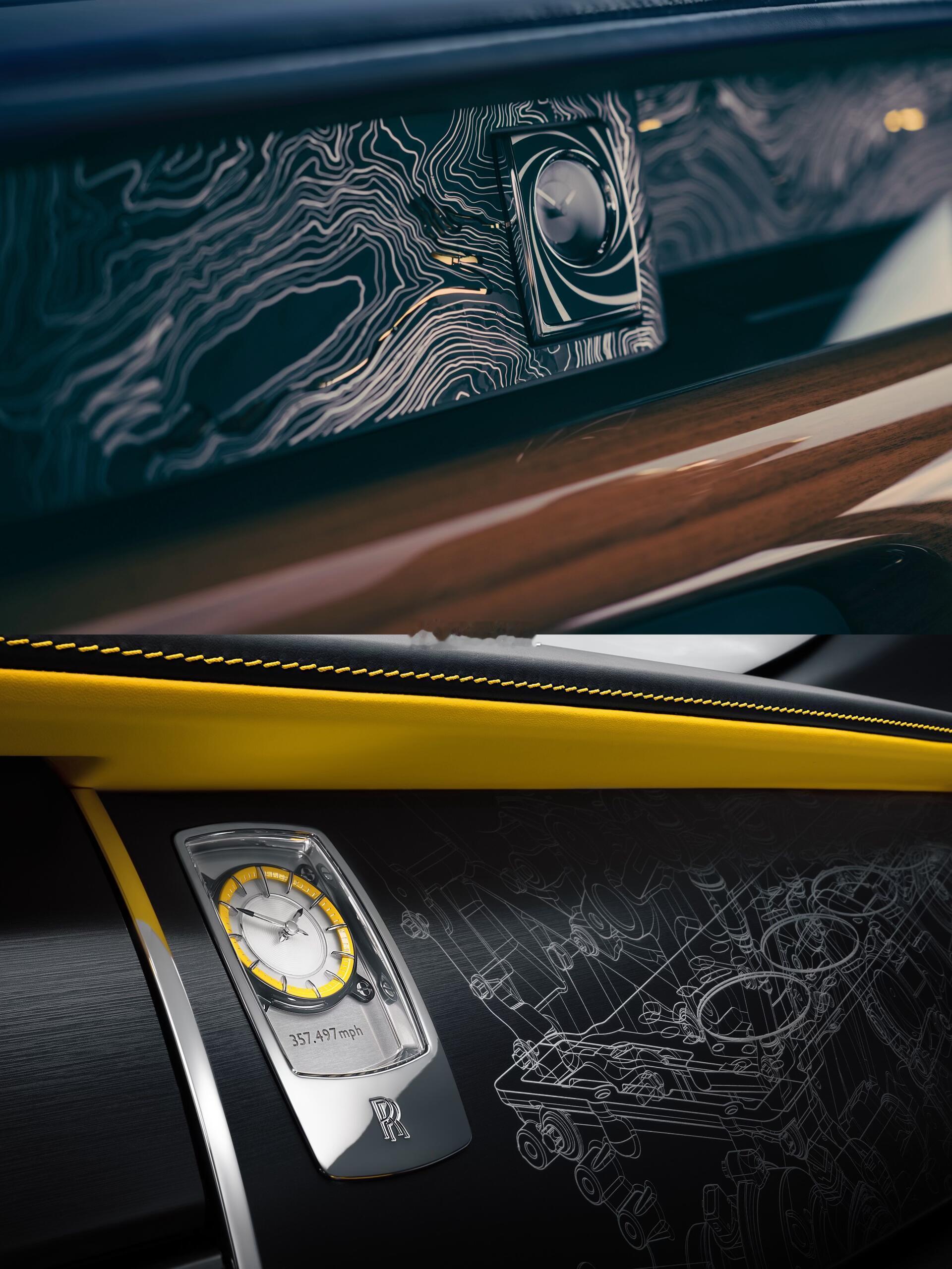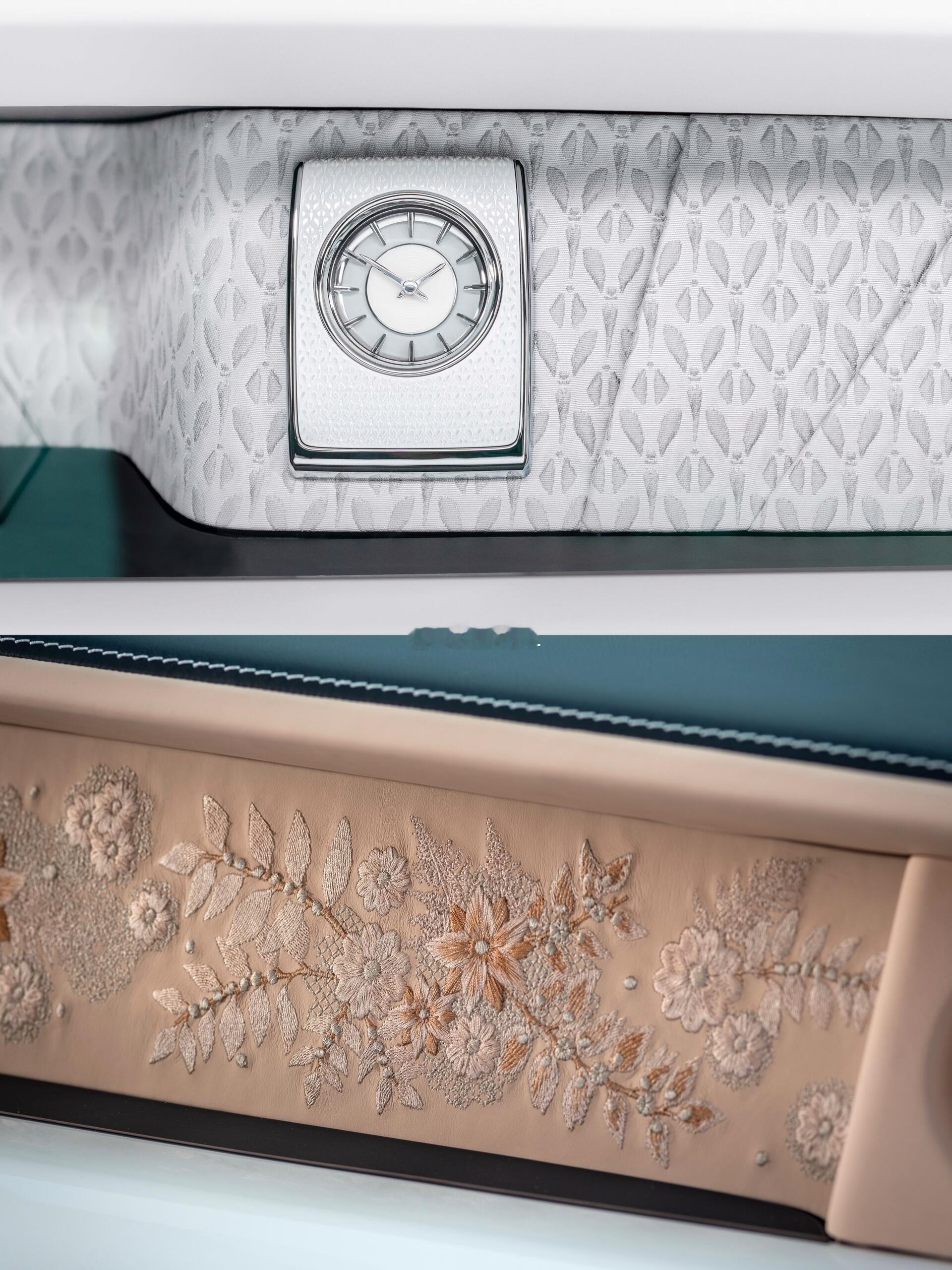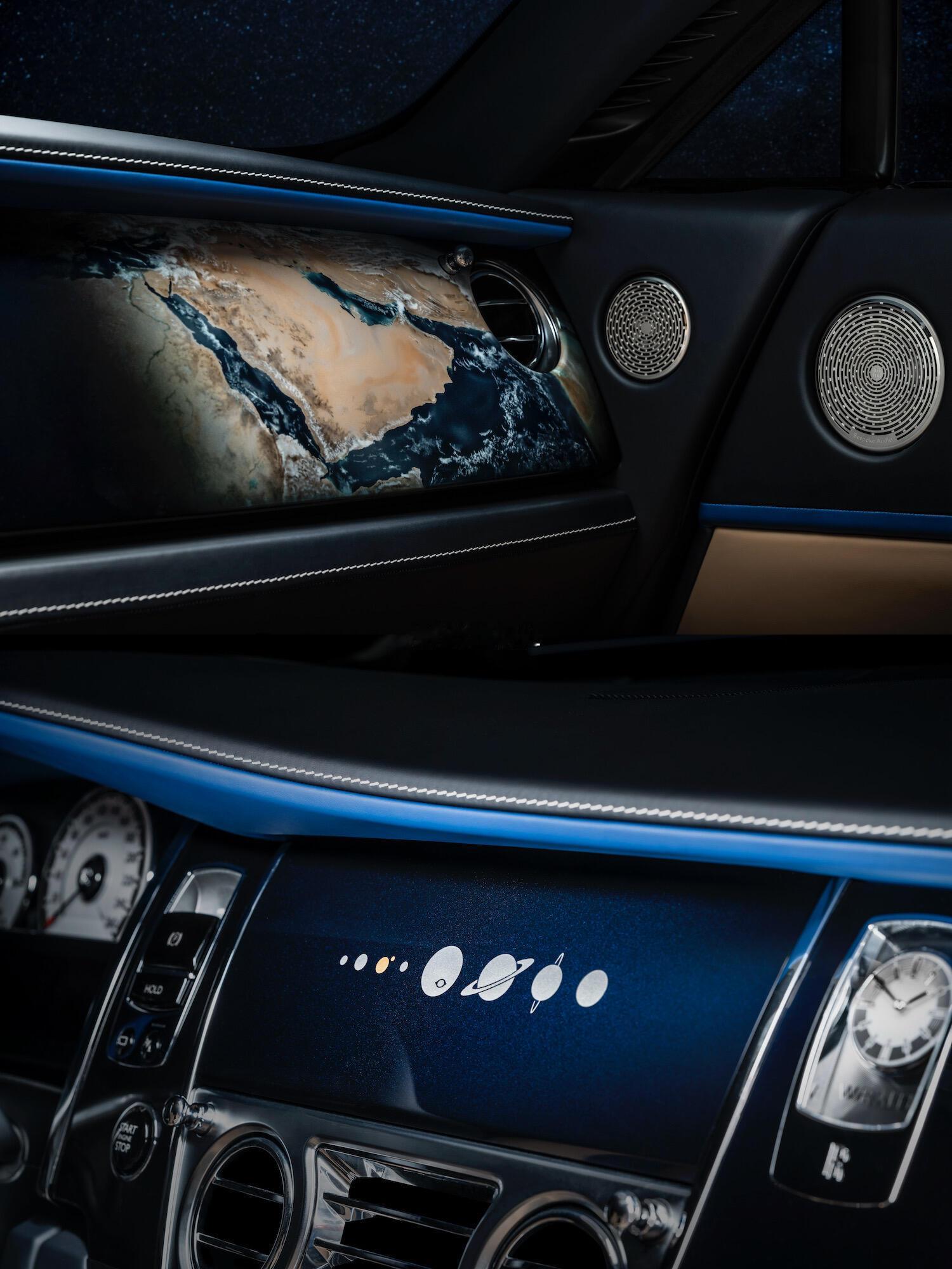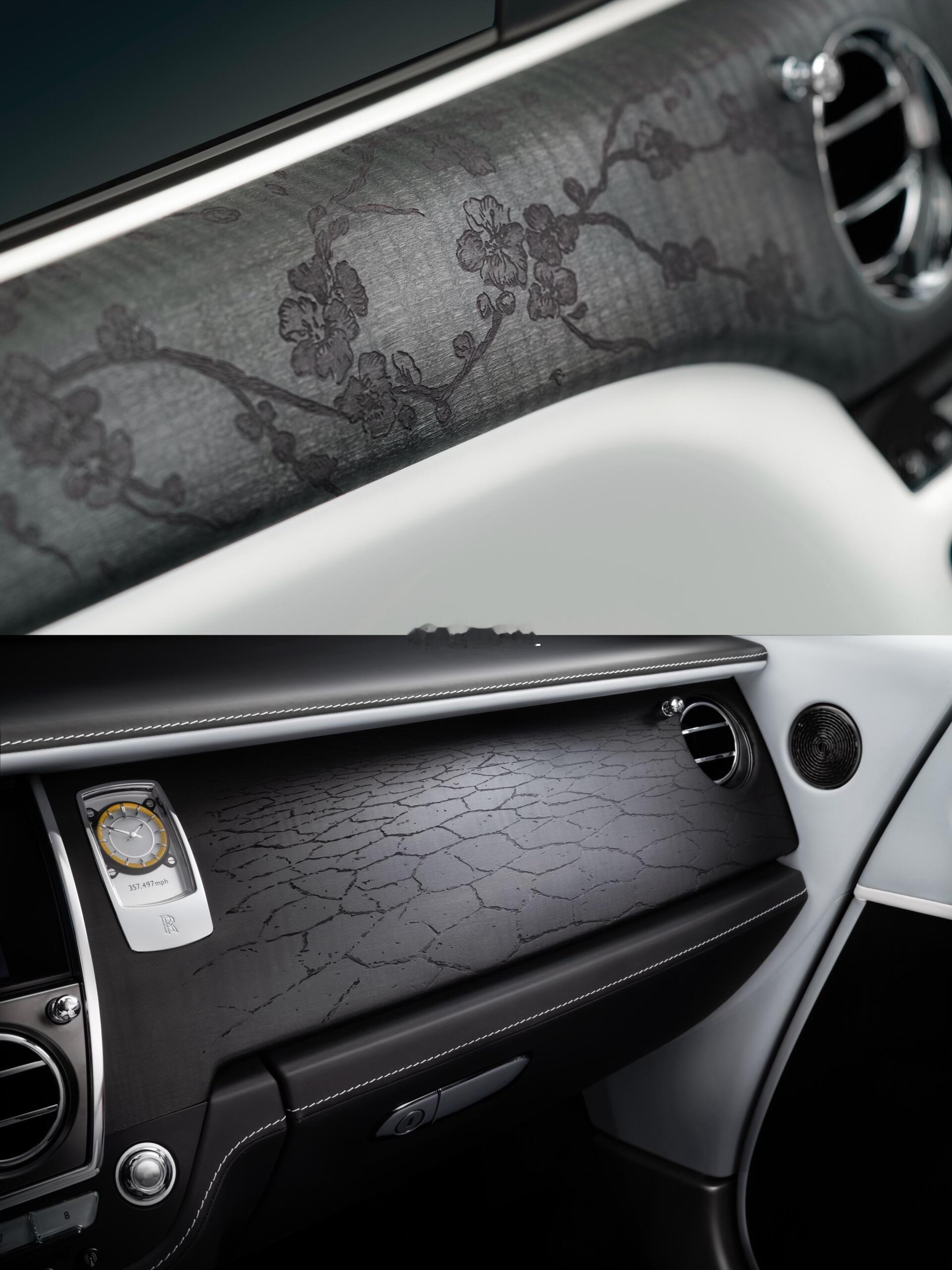 劳斯莱斯的各种花式中控台设计,尤其是副驾位置,做一些个性化设计,有绘制油画的,有绘制抽象图案的,有做抽象工艺的,有绣花的,有搞一幅地图的,有雕刻的,有印狗爪的……劳斯莱斯