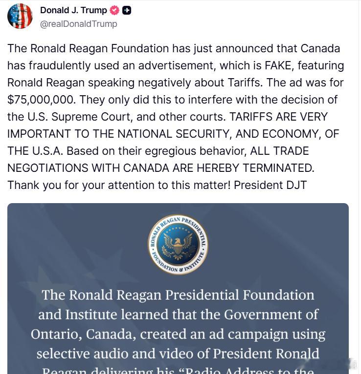 罗纳德·里根基金会刚刚宣布,加拿大欺诈性地使用了一则虚假的广告,内容是罗纳德·里根发表反对关税的言论。这则广告价值7500万美元。他们这么做只是为了干扰美国最高法院及其他法院的裁决。关税对美国的国家安全和经济至关重要。鉴于他们这种极其恶劣的行为,与加拿大的所有帽衣谈判即刻终止。