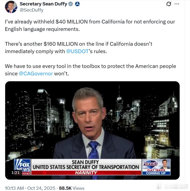 如果加州不立即遵守美国交通部的规定,还有1.6亿美元将被扣留。