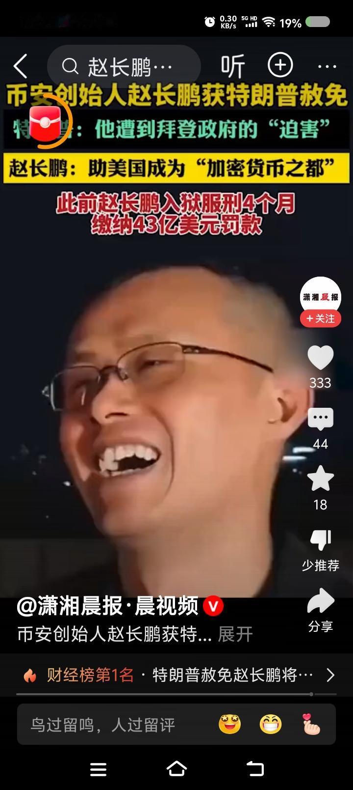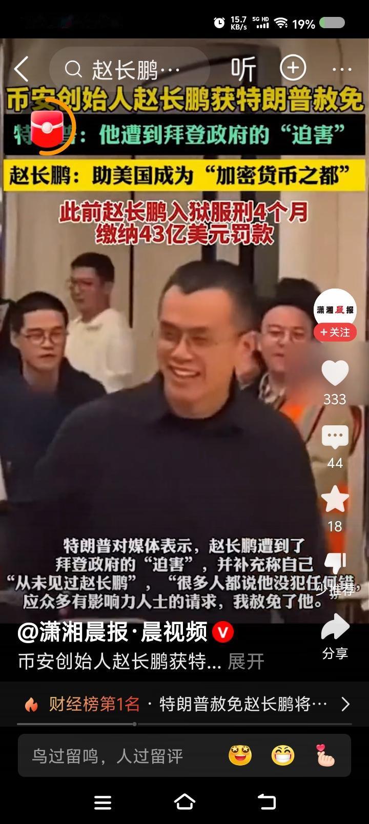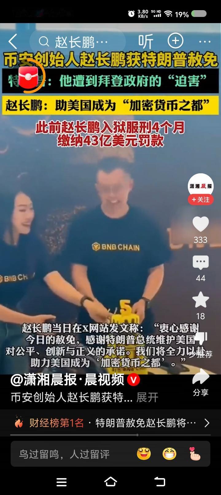 43亿美元的罚款?—— 据报道,商业人物赵某被特朗普赦免。特朗普称,他未见过赵某,他遭到拜登政府的迫害。之前,赵某服刑4个月,被罚43亿美元。赵某感谢特朗普对维护美国公平、创新、正义的承诺,全力以赴助美国成为“加密货币之都”。 点评: 一、既已服刑,何来赦免? 二、台湾省媒体人说,特朗普集团炒币获利丰厚。不知道与此有关么? 三、美国政客直白又虚伪。贪婪是赤裸裸的,又找各种理由。