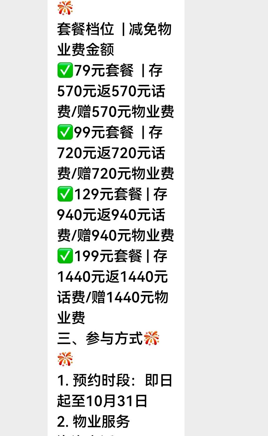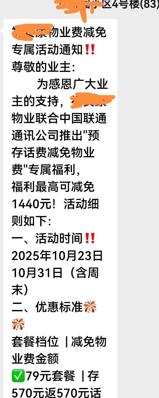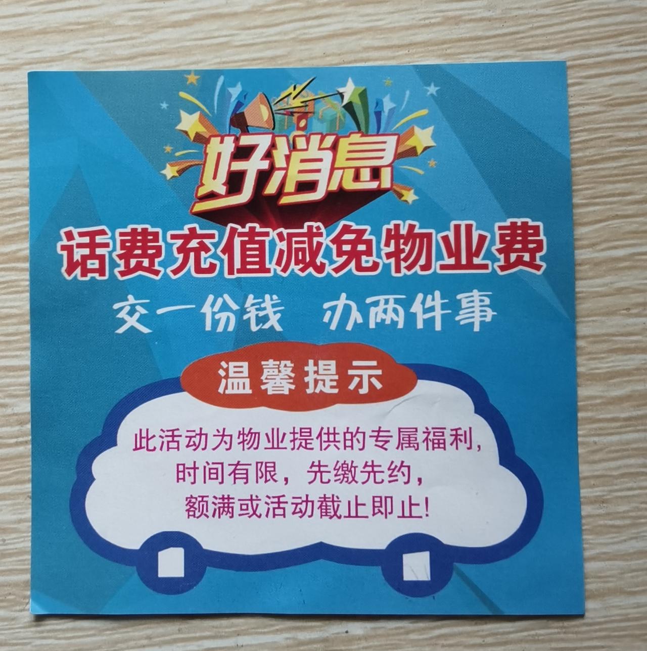 云里雾里的广告,是圈钱还是空降馅饼?人神共烧脑啊!我判读这种鬼斧神工的终极操作是俄罗斯套娃下大棋,所以犹抱琵琶半遮面,循循善诱。 我一进小区,在门面房的后墙上发现了好几个红色横幅(如图),上面写着:本小区业主专享福利。存话费=送话费+减免物业费!多存多送。 我似懂非懂。进楼后,见门上沾挂着十厘米见方的彩色胶印小广告(如图),上面除了横幅上的内容外,诱惑又进了一小步,说是:为了回馈本小区业主,物业公司联合通讯公司特推出……后面又说最低可免400块钱物业费,最高可免1440块钱的物业费。当然,留有手写的咨询电话号码。 小广告的背面的文字是:好消息,话费充值减免物业费,交一份钱,办两件事。温馨提示,此活动为物业提供专属福利,时间有限,先缴先约,额满或活动截止即止。 看到小广告,我还是一知半解,本能上大大的怀疑,小小的相信。首先,通讯公司多了,除了移动联通电信,还有什么网通铁通神通。许多卖手机修手机的门面店,也叫通讯公司。估计只是故意卖关子让你打电话询问。只要你打电话询问,接电话的人不用想都是口才了得。不可能轻易饶过你。 不管咋迂回渗透,通讯公司的核心意思是,你交了电话费,就等于再送你同样金额电话费,同时又交了等额的物业费。小区的入,谁都有手机,谁都要交物业费。电话费是预付款,你不预付,立刻停机。物业费可以滞后交,而且可以拖欠。这个广告的主体和收费的是通讯公司,他总不能收到话费,分一半给物业公司吧,本来就有许多业主拖欠甚至拒绝交物业费 能收到的物业费,只是收一半,物业公司离倒闭不远了。物业公司收分成的百分之九十五,心理都不爽。症结在于通讯公司图什么? 通讯公司的横幅和小广告没有印刷出具体小区名称,应该上广泛的。绝对是面向千千万万个小区。横幅和小广告的花费也是成千上万元。每家每户都挂小广告,雇人又得多少钱。自己砸巨资,帮物业公司收物业费,图什么?物业公司自己不会收物业费还是不好意思收取物业费?行不通,十月份也不是愚人节。而且广告方面语焉不详,诱导你找物业或打广告上的电话垂询。 做广告的电话经常主动纠缠骚扰你,唯恐避之不及。主动给他们打电话就等于鱼上钩了。是祸躲不过。找物业没有毛病,他忽悠不忽悠都是那么多物业费。跑了和尚跑不了庙。有住建局和政府管束。 给物业打电话,和通讯公司客服电话一样,机器说话,让查看本人楼栋业主群的通告。 我急忙看业主群。看完,事情基本上水落石出了。这个广告和创意是联通公司的手笔。横幅和彩印小广告有弄虚作假忽悠吊胃口的玄机。横幅和小广告上说,存话费=送话费+减免物业费。明示,你存一百块钱横幅,再送你一百块钱话费,再减免一百块钱的物业费。一百块钱当三百块钱用,物业通知的是实操,改成存一百块钱话费,减免一百块钱的物业费。就这,也足够逆天的。我疑惑,联通公司这是学雷锋还是脱了裤子放屁。用这种迷幻操作和物业公司捆绑,对物业公司是福还是祸。无疑是把千千万万个物业公司带上了江湖白道。 看到后面我有所领悟:联通公司只是放长线,钓大鱼,挖其他通讯公司的墙脚。 联通公司的操作,户外遮遮掩掩扭扭捏捏。不询问,不看业主群不知道是联通公司的大手笔。宣告的绝大部分是福利大饼,最后才画龙点睛,说不是联通公司用户的,可以带身份证携号转网。 这就现原形了。我不是联通用户,我知道联通的用户数量比移动和电信差距很大。移动毋庸置疑,电信有固定电话和很早的就有有线网络,曾经还有小灵通,树大根深。联通公司用户相对少,套餐费不得不高一些维持运营。携号转网实行以后,联通公司肯定有大量的用户转投其他运营商。传说联通的网络体验不是最佳,又不敢打价格战,商场如战场,持续下去,联通公司压力山大,所以放大招。 不得不承认,这样的计策还是有魔力的。首先巩固了现有的客户。联通用户交电话费就等于同时交物业费了,谁能拒绝?现在的人,不交话费就和不吃饭一样不可理喻。交电话费就包圆物业费了。联通公司套餐一年咋样也得一千块左右,物业费一般一平米一年六块,一千块钱的电话费抵付一百六十多平米的物业费。房子小可以顺延下一年。大多数人存半年前话费就抵付一年物业费。电话费是刚需,砍不掉。搂草打兔子,何乐而不为呢。 联通公司这一招的预期是第一功效保持水土不流失。第二是开疆拓土。给你一块钱当两块钱用的机遇,百分之百的回报率,比放高利贷还欢欣鼓舞。难免有人动心,携号转入联通网。 先用存话费同时送物业费把老用户固定住,诱惑其他人携号转网。把蛋糕做大。这个送福利操作时绝对没有那么简单。老用户恐怕要限制转网。新加盟的用户也不得随便携号再转网,这样,联通就能巩固并且扩大用户基数。理想很丰满,现实咋样,说不上。我不是联通用户。