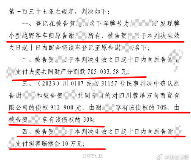 #两年被家暴16次女子被判获赔144万#【“两年被家暴16次案”当事人小谢获财产分割判决,共计现金144万余元】#小谢称要的不是钱而是一个交代# “我的财产分割判决书下来了。”10月24日,潮新闻记者从“两年被家暴16次案”当事人小谢处了解到,经成都市武侯区人民法院审理判决,其分得夫妻共同财产70万余元,离婚损害赔偿10万元,以及前夫贺某某母亲名下公司债权63万余元,并有二手车一辆,“他们共计应当给我现金144万余元。”不过,小谢表示,目前还没有收到对方是否上诉的消息。