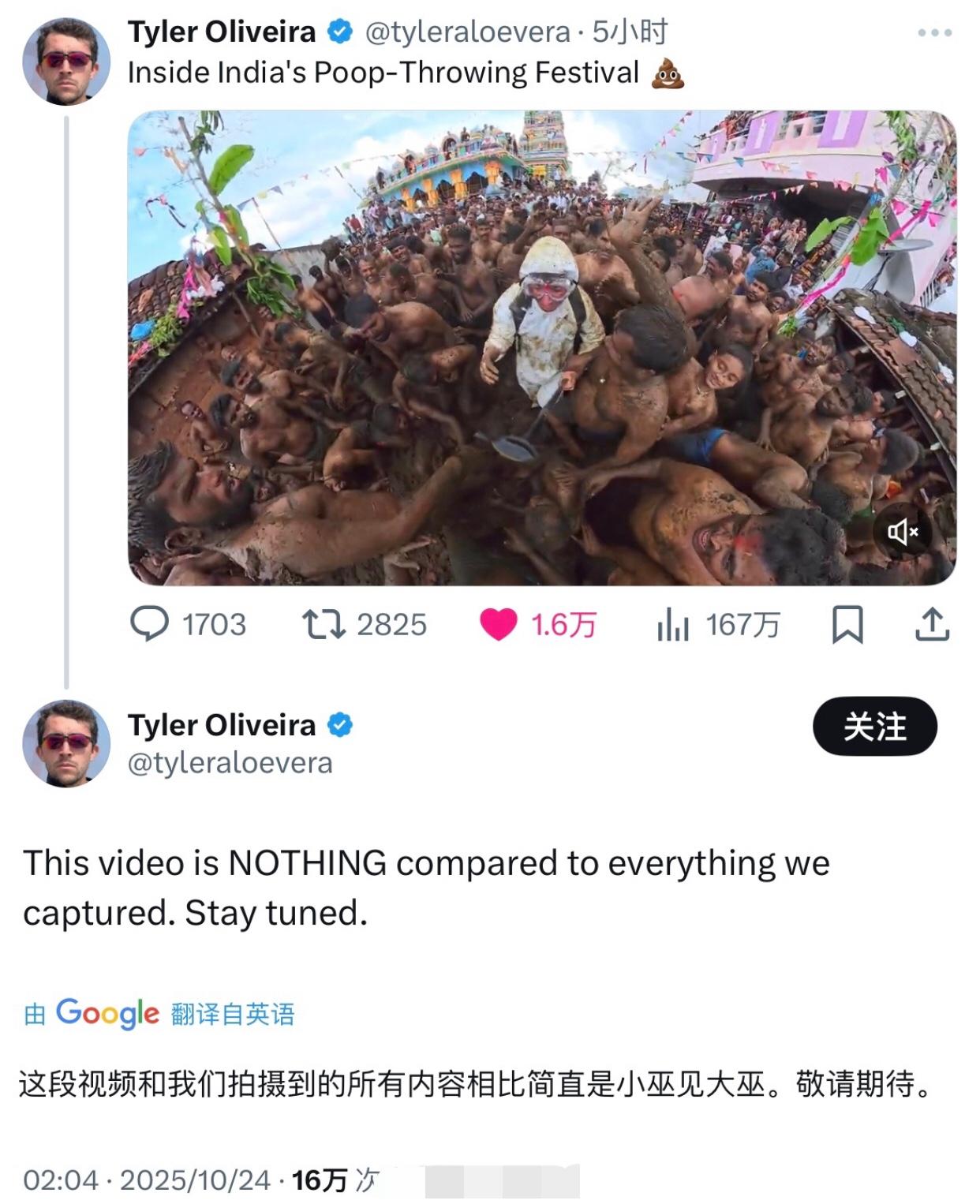 一位外国博主到印度去拍摄印度人庆祝“排灯节”的活动,并全程参与了印度的“扔屎节”。 他参加完“扔屎节”后,发文表示:“排灯节快乐!是的,我参加了印度的扔屎节,那是我这辈子最糟糕的经历,我再也不会去了,请祈祷我能活下来。 这段视频和我们拍摄到的所有内容相比,简直是小巫见大巫,敬请期待!”