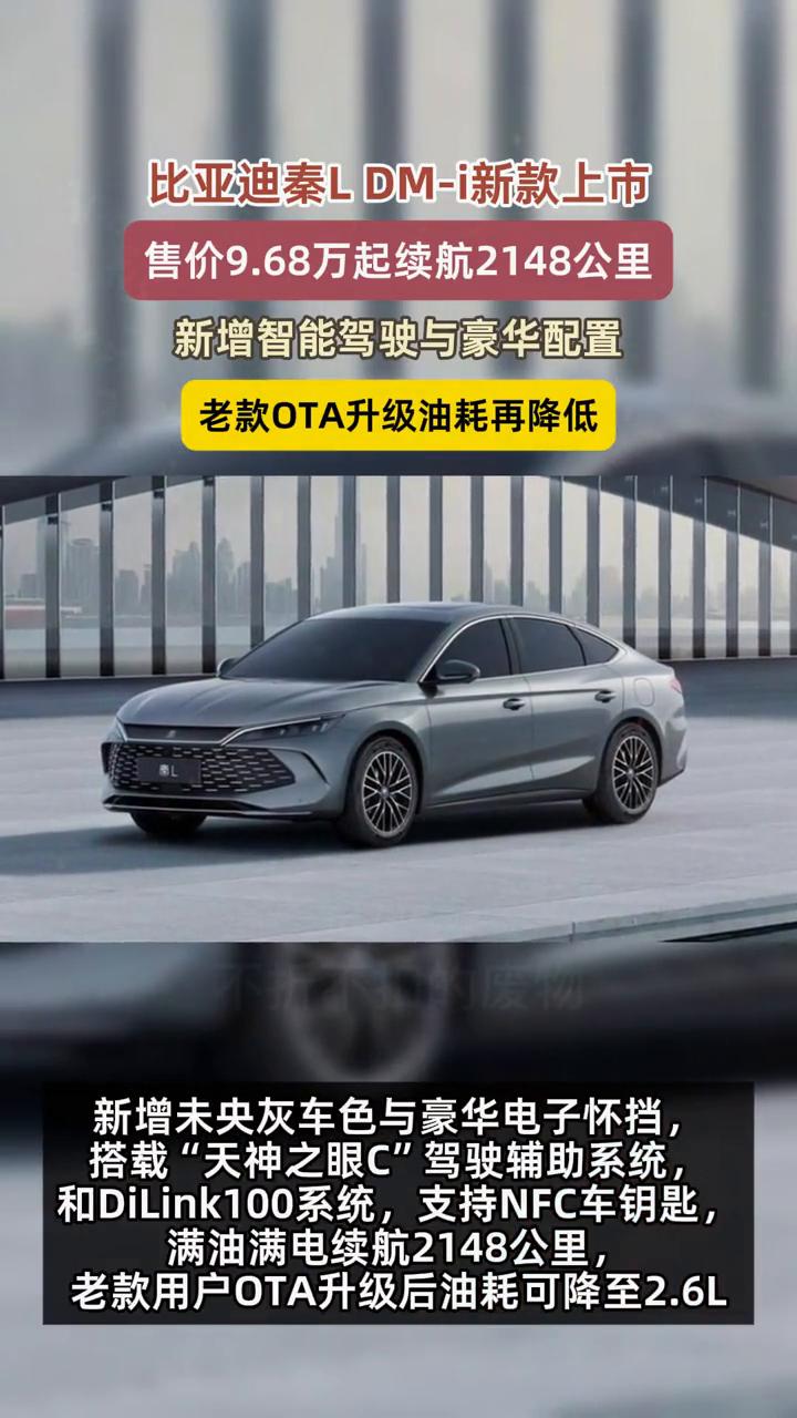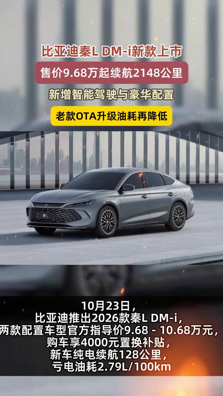 比亚迪秦LDM-i新款上市,售价9.68万起,续航2148公里,新增智能驾驶与豪华配置,老款OTA升级油耗再降低。 10月23日,比亚迪推出2026款秦LDM-i,两款配置车型官方指导价9.68-10.68万元,购车享4000元置换补贴。新车纯电续航128公里,亏电油耗2.79L/100km。新增未央灰车色与豪华电子怀挡,搭载"天神之眼C"驾驶辅助系统和DiLink100系统,支持NFC车钥匙。满油满电续航2148公里,老款用户OTA升级后油耗可降至2.6L。