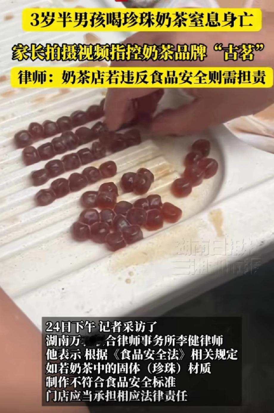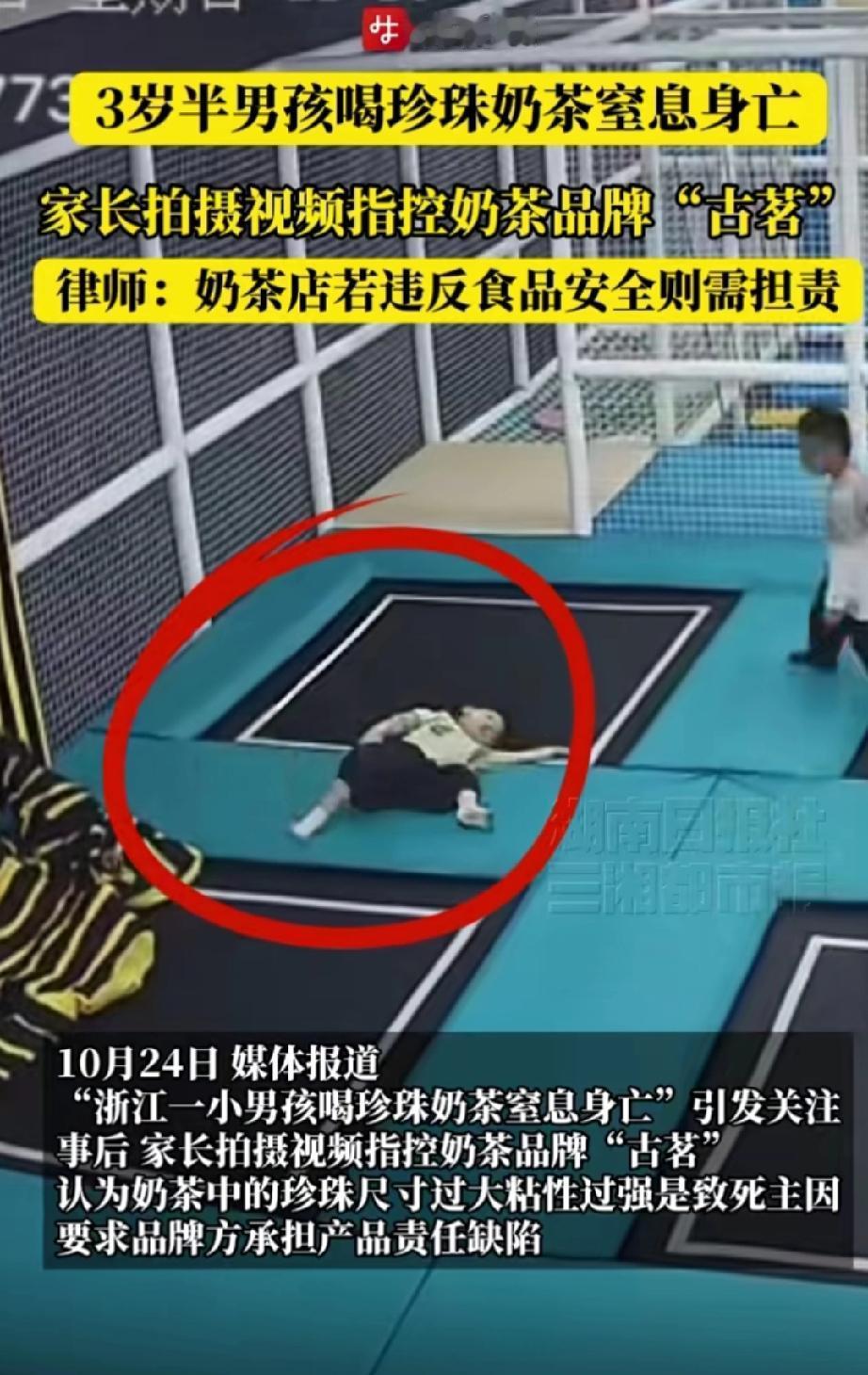 三岁半男孩喝完珍珠奶茶后,和小朋友在游乐场的蹦蹦床上玩耍时不慎摔倒,奶茶中的珍珠从胃里倒流出来,堵塞了男孩的气管,最终导致男孩死亡。 男孩倒地一段时间后,家长和游乐场工作人员才进入游乐场,看到男孩脸色苍白,却不知问题出在哪里,紧急送医后才得知是珍珠堵塞气管所致。 家长觉得,奶茶店未告知儿童不能食用珍珠,且珍珠尺寸过大,才致使男孩窒息,因此奶茶店要对男孩的死亡负责。 男孩喝的奶茶是家长让朋友帮忙从网上购买的,该奶茶店的网站上明确标注“儿童和老人在食用含有珍珠等小料的奶茶时,需有人在旁监护”。 男孩的骤然离世,让家长悲痛万分。 家长还认为,游乐场未能及时发现男孩被珍珠噎到并实施有效急救,和男孩一起玩耍的小朋友以及帮忙购买奶茶的朋友,都应承担一定责任。 此时,网友不禁质疑:“给三岁的孩子喝含珍珠的奶茶,家长难道就没有责任吗?” 律师称,如果奶茶里的珍珠尺寸如果不符合食品安全标准,奶茶店需承担责任。 奶茶含有大量糖分、不饱和脂肪酸以及奶精、糖精类物质,其中的珍珠、椰果等小料不易消化,其实并不适合儿童食用。 我认为,孩子被珍珠噎死,奶茶店和游乐场有一定责任,但家长的责任更大。不要等出了问题,就把责任都推给别人,这是不负责任的表现。 这样的悲剧出现,也给每个家长提了一个醒,要学会海姆立克急救法,以备不时之需。 并且不能让孩子便吃东西,便剧烈运动,以免出现意外。 来源:三湘都市报
