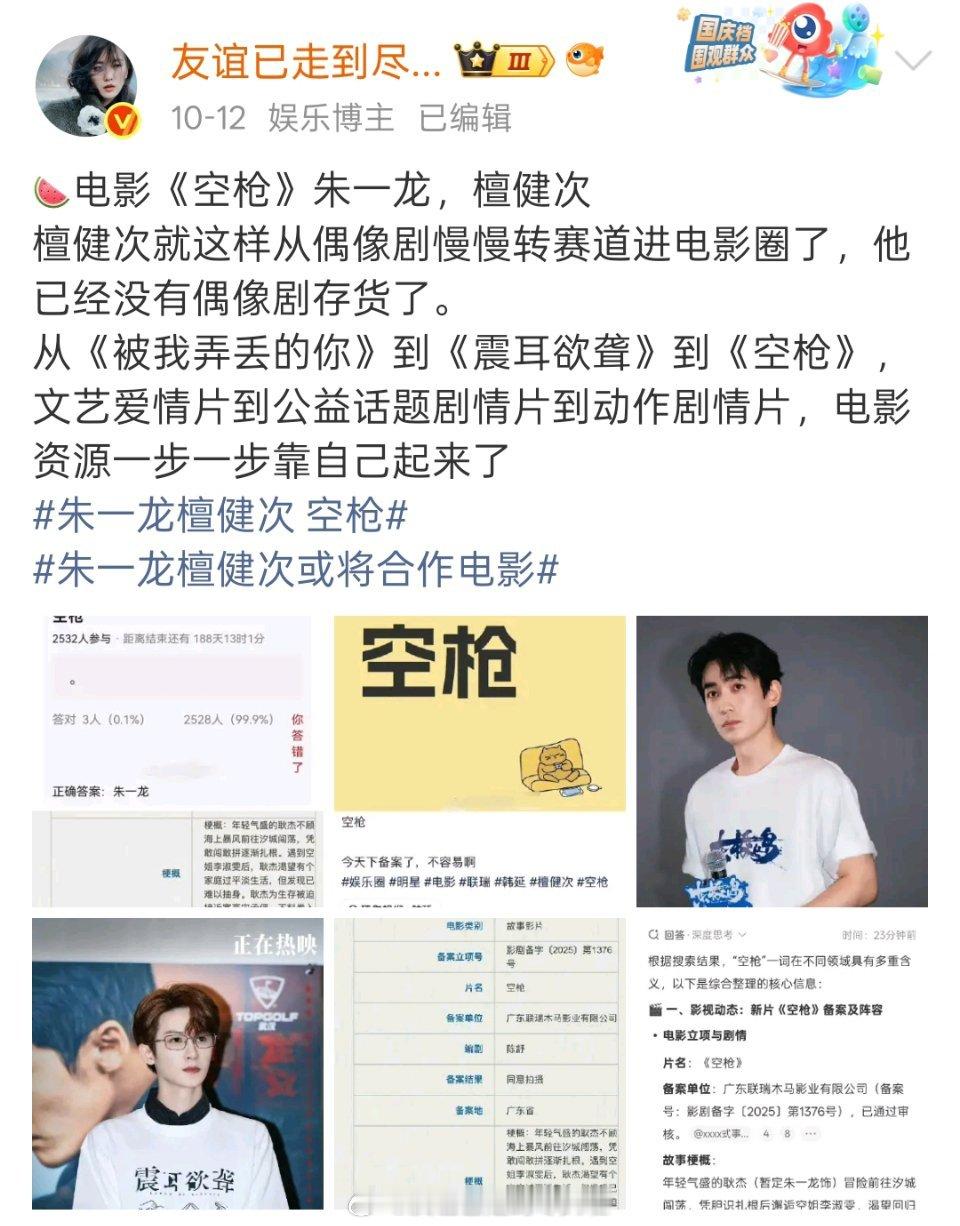 电影《空枪》竟然只官宣了朱一龙没官宣檀健次檀健次现在的势头比朱一龙强很多吧,竟然
