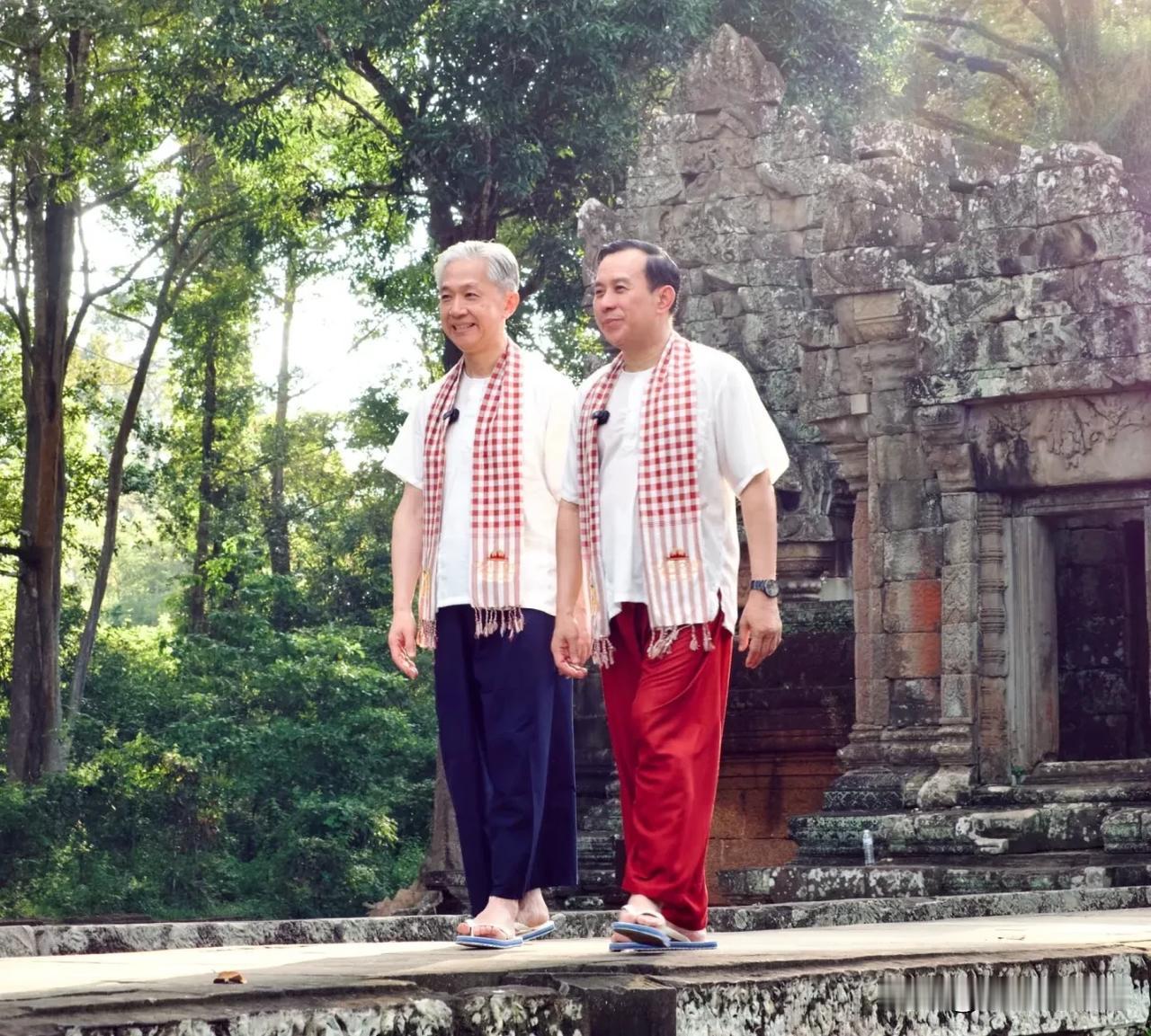 我国驻柬埔寨大使,汪文斌大使和柬方领导在中国援助修复的周萨神庙一起录制宣传视频。
