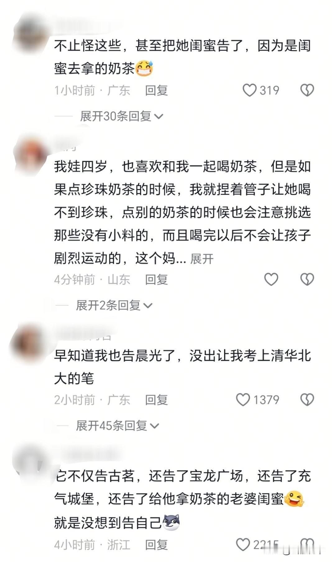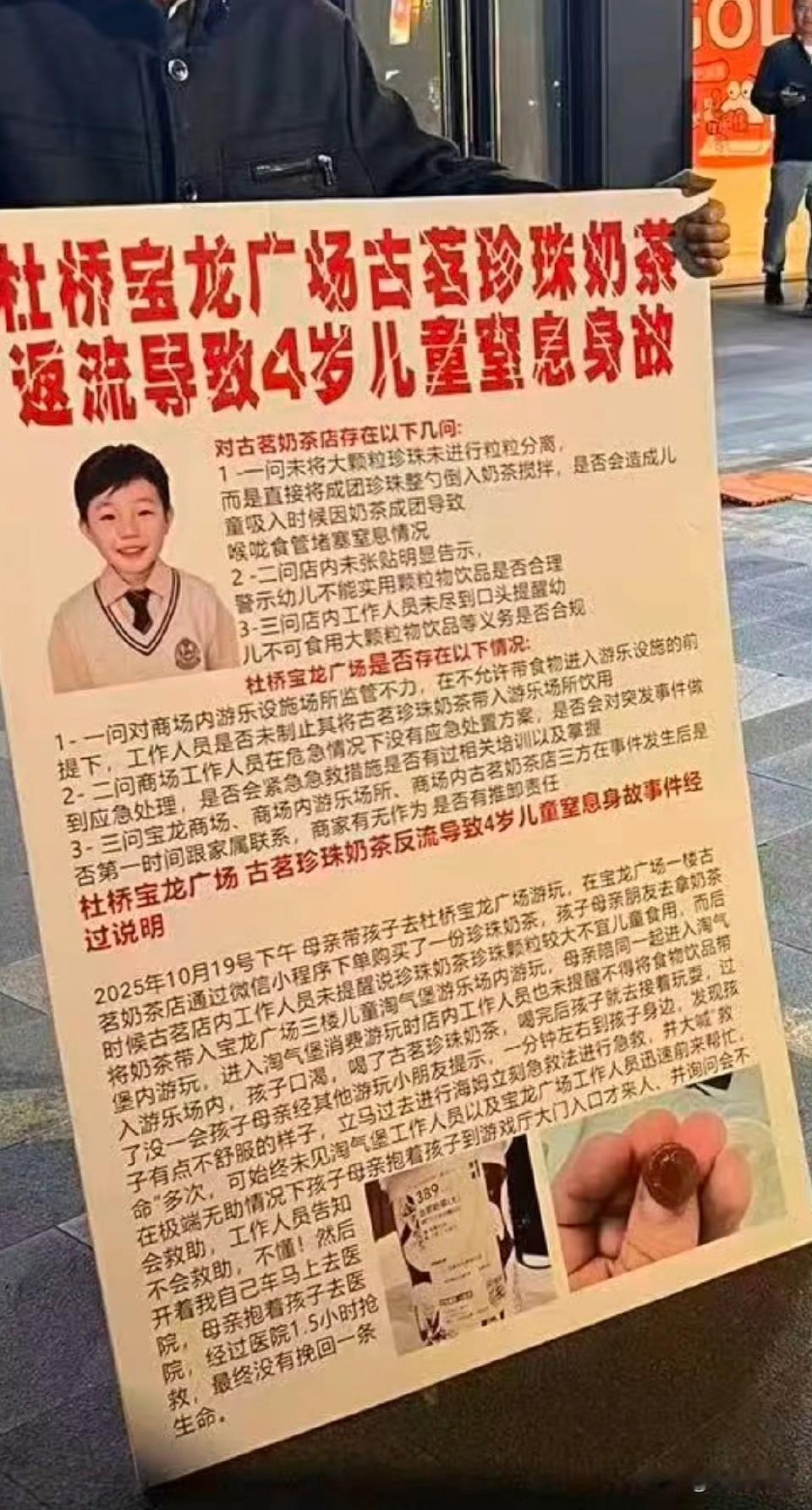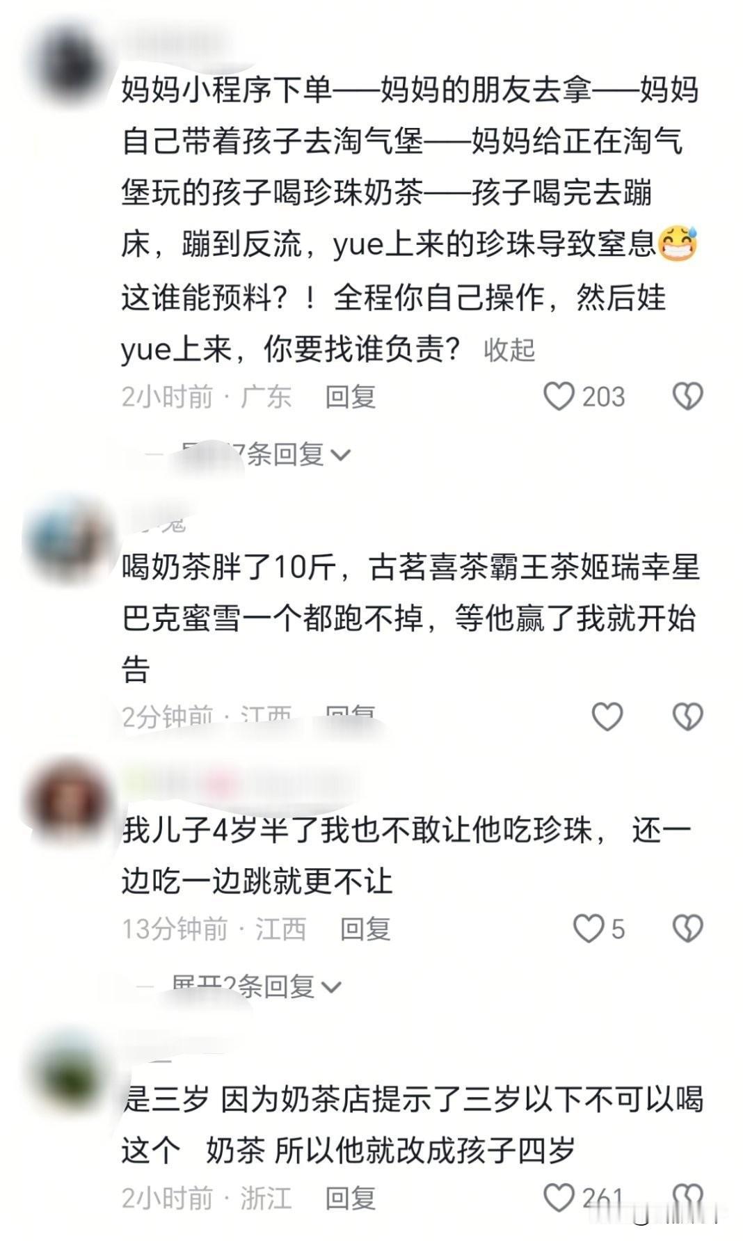 4岁男童喝珍珠奶茶窒息身亡,家属把所有人都告了,就是没告自己,近日浙江台州一4岁男孩因喝珍珠奶茶后蹦床,被珍珠反流噎住窒息身亡,家属质疑奶茶店未张贴明显告示,未口头告知孩童不可食用。 他怪古茗没有尽到口头提醒,怪游乐场员工没有制止她们把奶茶带进去,怪商场员工不会急救,反正都是别人的错,自己作为监护人就是没错。 小孩不懂事大人也不懂事,4岁你就给他喝珍珠奶茶,喝完还让他去玩蹦床,不要说小孩就是大人也会反流啊,最应该判刑的是家长,难道孩子会自己付钱买奶茶喝吗,还不是监护人给买的,就是可惜了孩子。 网友调侃:现在他不仅告古茗,还告了宝龙广场,还告了充气城堡,还告了老婆的闺蜜,因为闺蜜去拿的奶茶,就是没想到告自己[捂脸][捂脸]