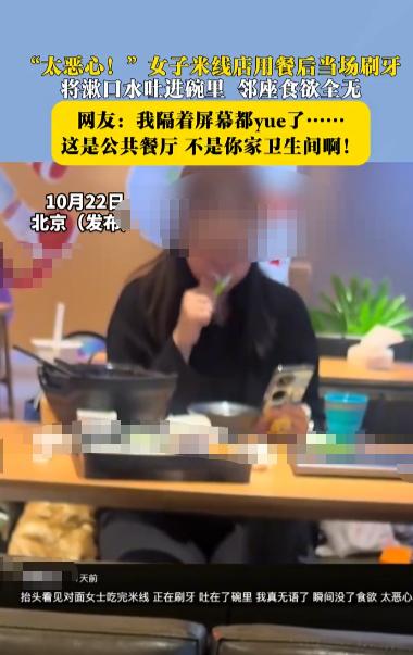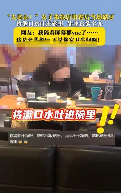 “太缺德了!”10月11日,北京,一女子在米线店用完餐后,竟然拿出牙刷牙膏当场刷起牙来,随后又将自己的漱口水吐进面前吃饭的碗里,网友:隔着屏幕都看吐了! 餐馆里的碗盘基本上都是循环利用的,虽然顾客使用完之后都会清洗然后消毒,可如果知道上一个顾客在碗里吐口水或者插烟头,未免还是会觉得恶心。 一女子在商场里的米线店用餐,吃完饭后,她从包里拿出牙刷和牙膏,旁若无人般用喝水的杯子刷起牙来,这简直是把米线店当成了自己的家。 随后,女子将米线店的碗拽到自己面前,将嘴里的漱口水自然地吐在了碗里,随后又继续拿起牙刷刷牙,旁边的顾客看到后瞬间没了食欲,只觉得一阵反胃。 吃完饭刷牙没有问题,可把漱口水吐在餐馆的碗里问题就大了,商场几乎每层都设置有卫生间,一些面积比较大的商场一层甚至会设置好几个,走几步去卫生间就那么难吗? 不少网友看后表示自己隔着屏幕都想吐,觉得女子是在传播病毒,有人认为女子就是假干净,做的事肮脏不堪,不管怎么说,女子的这种行为就是错误的,是没有公德心的表现! 信息来源:《“太恶心!”女子米线店用餐后当场刷牙 将漱口水吐进碗里》大象新闻