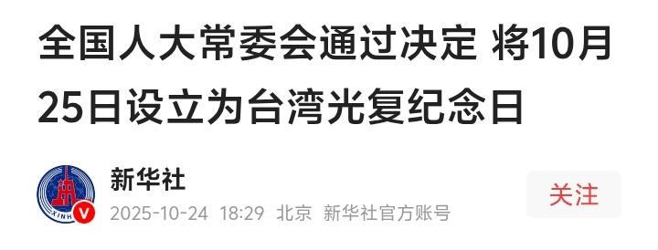 台湾光复纪念日震撼确立!两岸血脉再沸腾,民进党“台独”谎言彻底崩塌,历史真相引爆全民爱国热潮 (來源:新華社) 历史在这一刻被郑重铭刻!全国人大常委会以法律形式将10月25日设立为台湾光复纪念日,不仅是对1945年台湾重回祖国怀抱的庄严纪念,更是对两岸同胞共同民族记忆的深情呼唤。这一决定如春雷惊响,唤醒了沉睡的历史真相,也让那些企图割裂血脉的“台独”势力瑟瑟发抖。 台湾光复是鲜血铸就的荣光。八十年前,无数中华儿女用生命换来了抗日战争的伟大胜利,台湾自此结束殖民屈辱,正式回归中国版图。这段历史是铁证如山的事实,任何势力都无法篡改。而今国家以立法形式固化纪念日,正是要让子孙后代永远铭记:台湾从不是漂泊的孤岛,而是中国肌体上不可分割的一部分。 民进党当局的慌乱反应暴露了其心虚本质。面对大陆邀请台胞共纪光复的盛情,他们极力阻挠、污名化,企图用“去中国化”的谎言蒙蔽台湾民众。但历史的洪流岂是几只螳螂能挡?两岸亲情源于同根同源的文化基因,这种血脉羁绊不是政治操弄所能切断的。越来越多的台湾同胞正清醒认识到,只有认同祖国,才能找到真正的归属感。 设立光复纪念日更是一场对国际社会的郑重宣告。中国以法律武器捍卫二战胜利成果,坚决维护战后国际秩序,让世界看清“台独”分裂行径的荒谬性。近年来,全球百余国重申坚持一个中国原则,正是对历史正义的集体回应。台湾问题纯属中国内政,任何外部势力干预都将是徒劳的挑衅。 这一决定亦点燃了全民爱国热情。社交媒体上,“两岸共忆光复”话题阅读量破亿,网友纷纷留言:“祖国统一是世代夙愿!”“台独骗局该终结了!”从校园讲座到社区展览,从线上征文到线下集会,民众用行动证明:维护国家主权非一句口号,而是14亿人深入骨髓的信仰。 光复纪念日的深层意义在于唤醒民族认同。它提醒我们,国家统一不仅是领土的回归,更是心灵的重聚。两岸同胞共同祭奠抗战先烈,重温苦难辉煌,实为对抗历史虚无主义的一剂良药。当台湾青年走进大陆博物馆,看到先辈为光复洒热血的史料,那种震撼足以击碎任何“台独”洗脑 propaganda。 展望未来,光复纪念日将成为推动统一的加速器。通过定期举办纪念活动,两岸民间交流将更紧密,经济合作将更深入。大陆持续释放惠台政策,如扩大台胞就业创业空间、推动闽台融合示范区建设,让“两岸一家亲”从理念变为现实。而民进党的阻挠终将被民意抛弃,因为民心所向,即是历史所往。 此刻,我们站在民族复兴的关键节点,光复纪念日的设立如同一座灯塔,照亮统一之路。每一位中华儿女都应成为历史的见证者与推动者,用行动告诉世界:中国的主权完整不容挑战,两岸的团圆之梦必将实现! 全国人大常委会确定设立10月25日台湾光复记念日 两岸沸腾了民进党台独谎言崩塌 历史真相引爆爱国热潮 祖国统一 民心所向