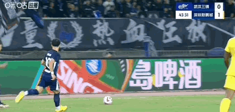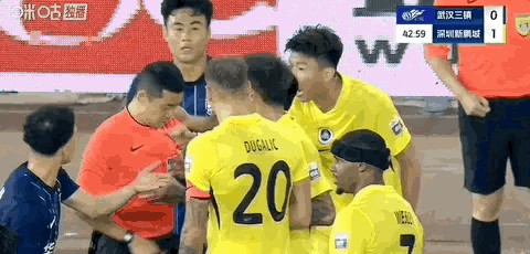 武汉三镇vs深圳新鹏城 比赛43分钟,杨一鸣肘击沈子贵,张雷出示红牌将其罚下,新鹏城十人应战。