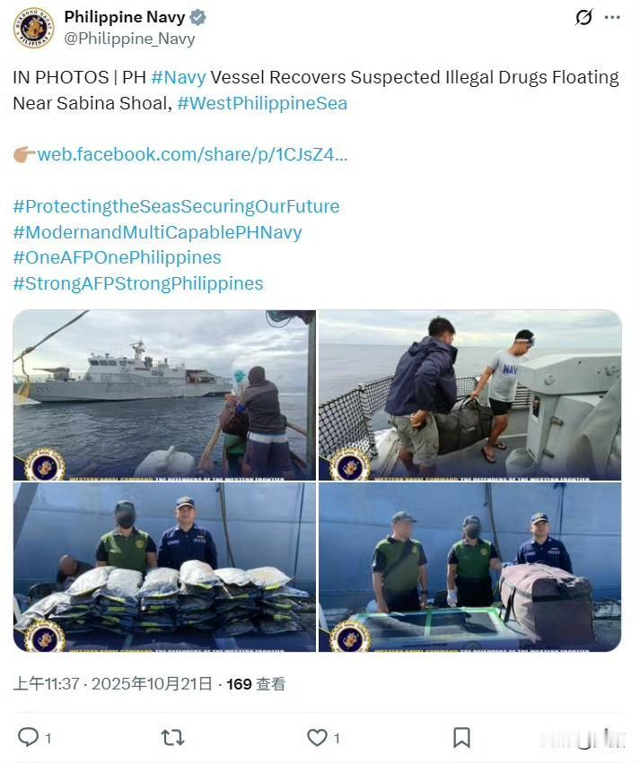 菲律宾海军称在南海仙宾礁发现疑似毒品。10月21日,菲律宾海军宣布,该国军舰在南海进行“例行巡逻”期间,在仙宾礁附近海域没收了大量高纯度毒品。 据菲律宾媒体报道,菲海军的一艘巡逻舰在仙宾礁附近海域发现一个漂浮的黑色袋子,打捞后发现里面有32个塑料袋,装有16公斤高等级大麻,价值估计1920万比索(约合122万人民币) 。菲海军发言人表示,菲执法机构正在就此事进行调查,以弄清毒品的来源 。 小菲这是想学美国,把中国当委内瑞拉了?