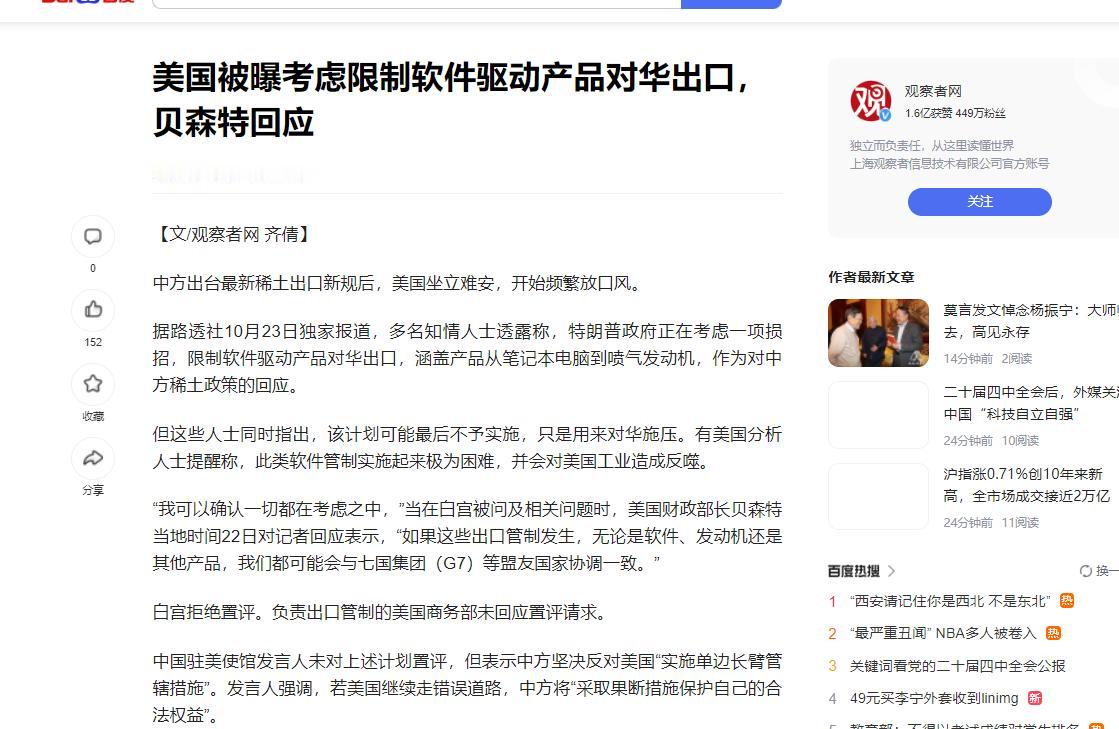 美国这次真是被逼到墙角,明摆着要孤注一掷了!财政部长贝森特公开放话要拉着 G7 国家一起限制软件对华出口,连 “所有选项都在考虑” 这种狠话都抛出来,说白了就是想靠这招逼中国让步,可这招根本就是杀敌八百自损一千的昏棋,透着一股急眼了的狼狈劲儿。 咱们得先弄明白,美国为啥突然要拿软件开刀?还不是因为中国的稀土牌捏得它疼了。这阵子中国收紧了稀土出口管控,美国的高科技、军工、汽车这些命脉产业立马慌了神,没有稀土,他们的芯片造不出来,战斗机引擎转不动,连汽车零件都没法生产。 特朗普本来想靠加征 100% 关税吓唬人,结果中国根本不吃这一套,他手里那点筹码根本不够看,急得没办法才想出限制软件这招,妄图用这个对冲稀土的压力。可他们不想想,软件出口这事儿,美国自己的损失可能比咱们还大。 贝森特嘴上说要和 G7 盟友协调,可这事儿根本没那么容易成。之前美国搞芯片限制的时候,盟友们就磨磨蹭蹭不配合,荷兰的 ASML 迟迟不肯断供,德国企业更是偷偷和中国做生意,毕竟谁也不想丢了中国这么大的市场。 这次要限制软件,涉及的范围更宽,从笔记本电脑到飞机引擎都算,欧洲那些靠软件出口吃饭的企业第一个不答应。 德媒都报道了,欧盟虽然嘴上说要反制,可真要动真格,他们自己的工业先得受重创,这种损人不利己的事儿,盟友们怎么可能真心跟着美国干? 美国心里门儿清,所以才只能先放狠话施压,本质就是赌一把,赌中国会怕,赌盟友能被绑架,这不是孤注一掷是什么? 再说美国自己的损失,那可不是小数目。之前他们搞芯片管制,已经让美国企业亏了几百亿美元,要是真把软件出口给禁了,损失得超 500 亿,10 万个工作岗位就得没了。 500 亿美金是什么概念?相当于美国好几个州一年的税收总和,10 万个岗位背后就是 10 万个家庭的生计,特朗普天天喊着 “做强美国实体经济”,这么干简直是打自己的脸。 就说微软、甲骨文这些大公司,中国市场占了他们不少营收,真要是断了合作,股价就得跌,股东们第一个不答应。 之前特朗普一会儿禁英伟达芯片,一会儿又取消,一会儿限 EDA 软件,一会儿又放开,反复无常的样子早就暴露了他的底气不足,现在又拿软件说事,根本就是硬撑着孤注一掷。 可能有人会问,美国软件真要是断供,咱们受得了吗?说实话,短期肯定有影响,比如今年 5 月美国限制 EDA 软件出口,咱们的芯片设计企业确实头疼了一阵子。 可美国太小看中国的韧劲了,你越卡脖子,咱们越能逼出自己的本事。就在上周深圳的湾芯展上,咱们国产的 EDA 软件已经亮相了,原理图设计、PCB 设计这些关键功能全都能实现,直接填补了空白。 这就跟当年美国禁华为安卓系统一样,结果华为立马拿出鸿蒙,现在鸿蒙用户都好几亿了。美国要是真敢禁软件,等于把这么大的市场拱手让给国产企业,用不了一两年,咱们的软件就能顶上来,到时候美国再想卖,门儿都没有。 更有意思的是,美国这时候搞这出,正好撞在中美谈判的节骨眼上。贝森特几天后就要和中国谈判,现在放狠话就是想在桌上多要筹码,逼中国松绑稀土、买他们的大豆。 可中国早就把他们的套路摸透了,特朗普这几年动不动就掀桌子,可每次都得灰溜溜回到谈判桌,上次贝森特还气急败坏地人身攻击中方代表,丢了面子又没占到便宜。 咱们手里的牌可比美国实在,稀土管制掐着他们的命门,不买大豆能砸了特朗普的选票盘子,芬太尼本来就是他们自己的社会问题,根本拿不出像样的筹码。 美国心里也清楚,真要是撕破脸,他们的工厂几个月内就得停产,中期选举肯定输,所以才只能孤注一掷,靠威胁碰碰运气。 这些年美国对华贸易战打了八年,从关税到芯片再到软件,一步步升级,看似来势汹汹,实则是黔驴技穷。他们嘴上喊着脱钩,可中国对美出口占比从 20% 降到 14.6%,全球出口占比反而升到 14.6%,比贸易战前还高。 这说明什么?说明美国根本挡不住中国发展的脚步,他们的限制越狠,咱们的自主化之路走得越稳。现在美国拉着 G7 搞协调,本质就是想靠人多壮胆,可盟友们各有各的小算盘,谁也不想为了美国的霸权牺牲自己的利益,这种松散的联盟根本经不起考验。 说到底,美国这次搞软件出口限制,就是典型的孤注一掷。国内有政府停摆、选举压力,国外被稀土牌卡得难受,手里实在没别的招了,才想出这么个伤敌一千自损八百的笨办法。 他们以为软件是自己的王牌,以为能逼中国屈服,却忘了中国从来不吃威胁这套,更忘了自己的企业根本承受不起失去中国市场的代价。 这把赌局,美国从一开始就输定了,就算真的实施限制,最后疼的还是他们自己,咱们只要沉住气搞自主创新,早晚能让他们为这孤注一掷的愚蠢行为后悔。