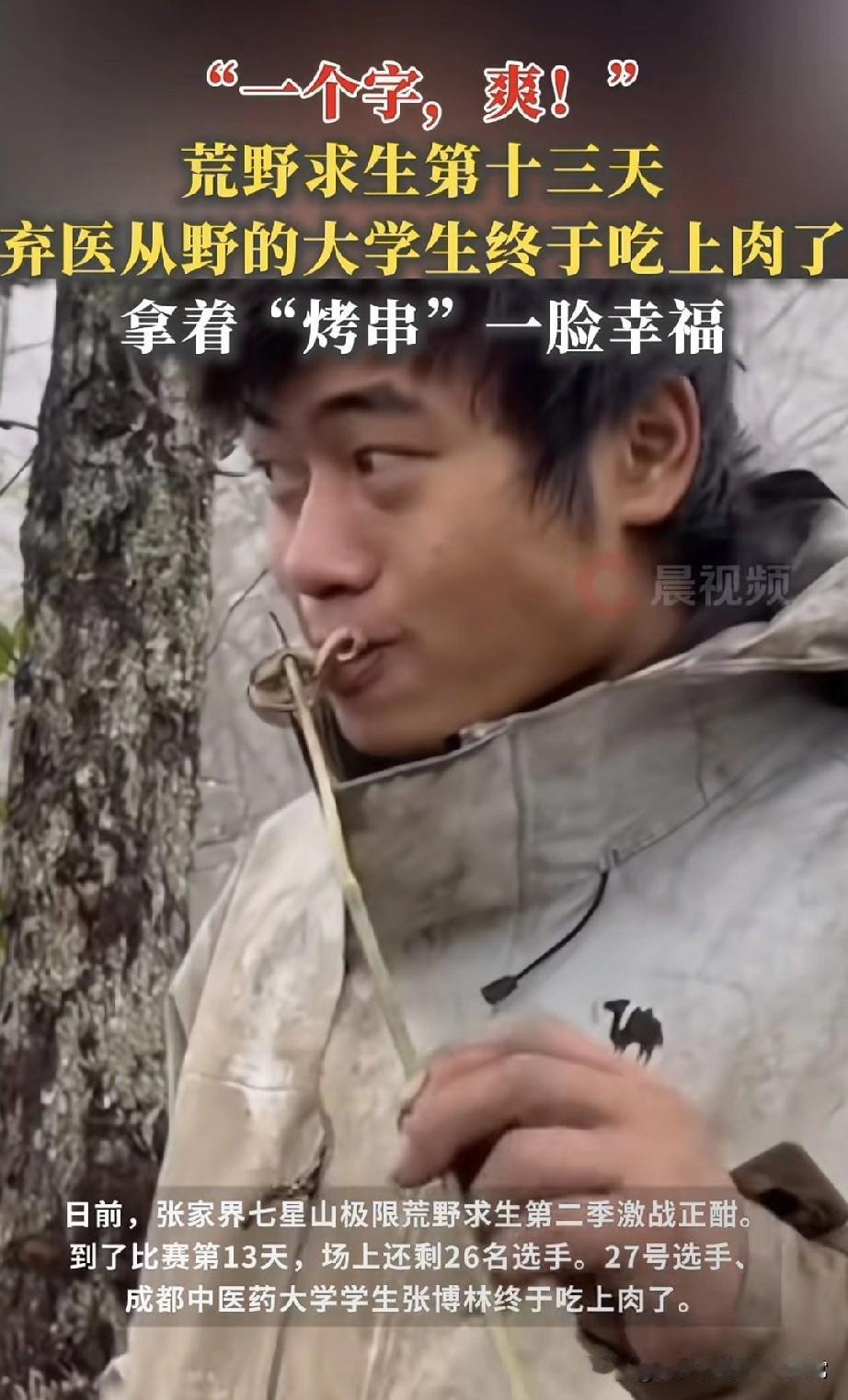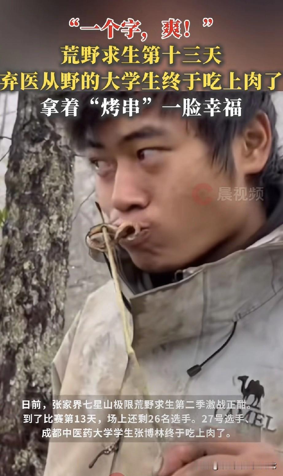 荒野求生13天吃上肉!拿着“烤串”笑到裂开! 张家界七星山荒野求生赛杀疯了!成都中医药大学的张博林,放着好好的医学路不走,偏要去荒野里“找虐”。熬到第13天,终于吃上肉了,举着烤串那叫一个幸福到飞起,直喊“一个字,爽!” 咱就说,放弃学医去荒野饿肚子,只为这一口肉?有人觉得这是追求极致自由,够野够带感;但也有人吐槽,这不是瞎折腾吗?学医救死扶伤不香吗? 你觉得这波“弃医从野”的操作,是真潇洒还是脑子热?