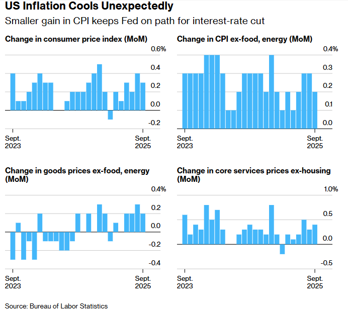 摩根士丹利财富管理公司的埃伦·岑特纳表示,CPI报告证实了政府关门期间从私营部门获取的数据所反映的趋势——没有迹象表明通胀正在飙升,也没有迹象显示就业市场正迅速恶化,“对于以审慎‘风险管理’为导向的美联储来说,这应该意味着下周将再次降息,并且可能还会有更多降息。”