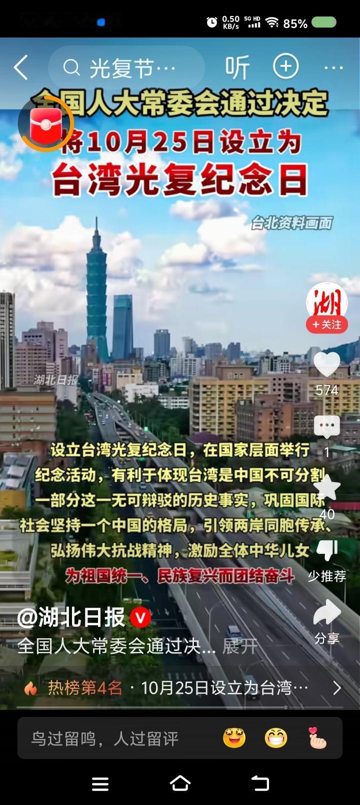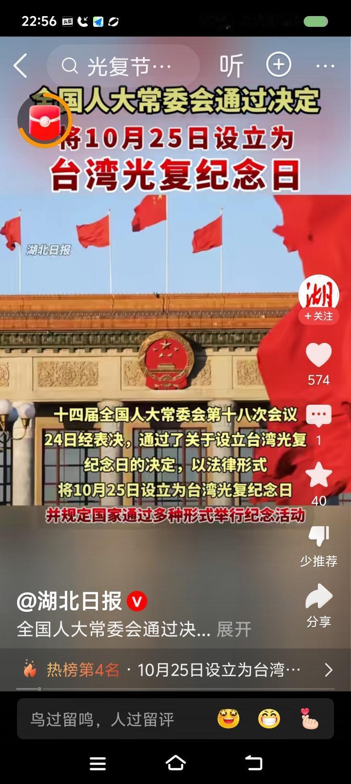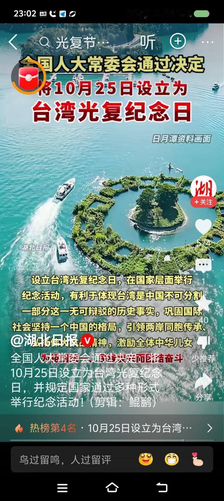 全国人大立法:设台湾光复纪念日—— 据报道,10月24日,全国人大常委会通过决议,设10月25日为台湾光复纪念日。 点评: 1945年10月25日,台湾省受降仪式在台北举行。台湾重回祖国怀抱。 “和平统一,一国两制,但不承诺放弃武力。”这是对台工作的方针。 留给台湾省政府和民众的时间不多了! 分离之苦,两岸人民在承受。