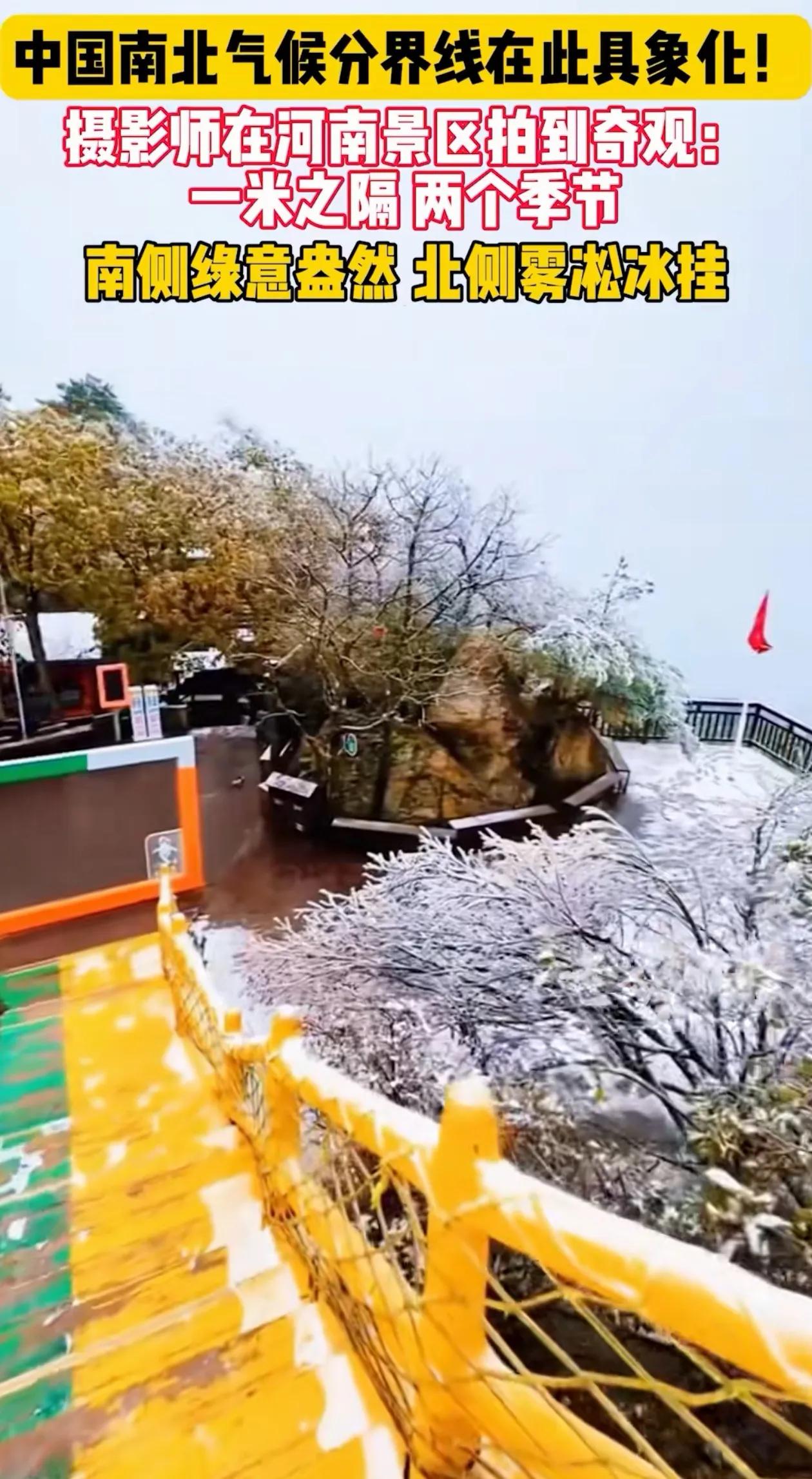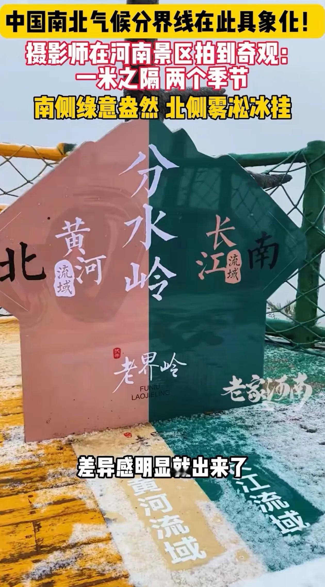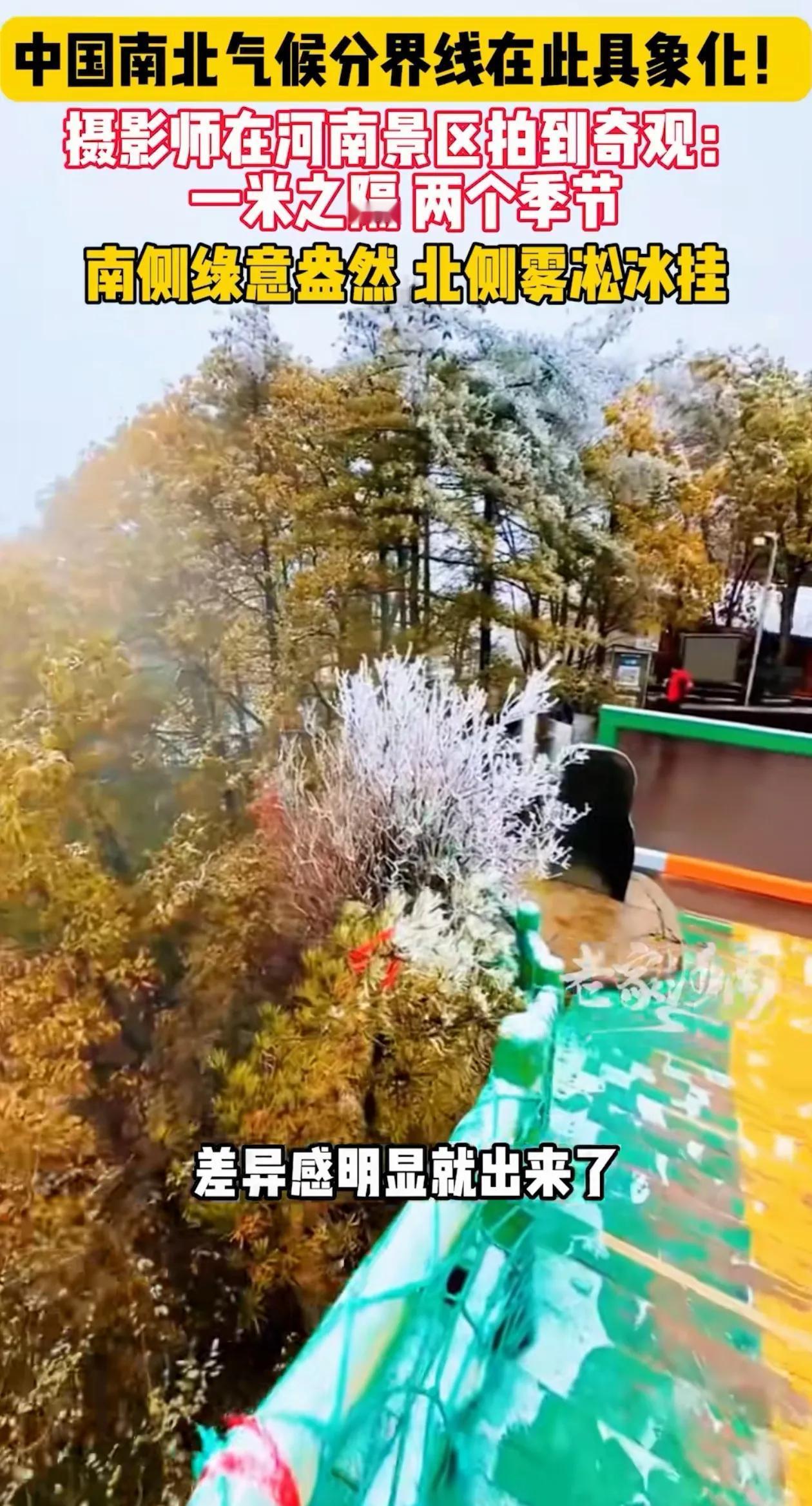 中国南北气候分界线在此具象化:一米之隔两个季节南侧绿意盎然北侧雾淞冰挂
