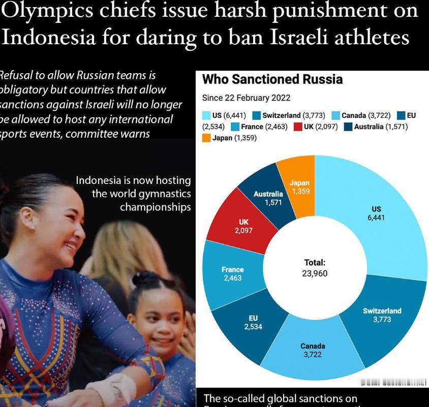 国际奥委会:如果你们禁止以色列,我们就会进一步禁止你们 国际奥委会10月22日禁止印度尼西亚无限期举办任何类型的国际体育赛事,因为印度尼西亚选择不允许以色列运动员入境。 这次的导火索是雅加达举办的世界体操锦标赛,以色列本来备好了 6 人参赛名单,里头还包括一位东京奥运会自由操冠军,赛前甚至拿到了主办方 “可以正常参赛” 的口头承诺,结果临开赛被印尼司法部长一句话否了。 印尼这边态度很坚决,一方面和以色列本来就没建交,外交立场摆在这儿;另一方面国内穆斯林民众对加沙局势反应强烈,真让以色列选手入境,搞不好会引发大规模抗议,威胁社会稳定,权衡之下还是选择了拒签。 国际奥委会的反应快得惊人,上来就亮了杀招。不光直接终止了和印尼关于 2036 年申奥的所有对话,等于把人家筹备许久的奥运梦给掐灭了。 还公开给全球所有国际体育联合会打招呼:没拿到印尼 “无差别发放签证” 的书面保证前,别往那儿安排任何比赛、任何会议。 更甚者,还要求印尼奥委会和国际体操联合会专程去瑞士洛桑的总部 “接受问询”,说白了就是过去听训,啥时候答应以后不管哪个国家的运动员都一路绿灯,啥时候再谈解除制裁的事。 印尼体育部长后来回应,说这决定是为了维护国家安全和公众利益,国家利益永远比体育规则重要,早就料到会有后果,认栽但不后悔。 可这处罚确实够狠,印尼近些年好不容易承办了篮球世界杯、亚洲杯这些国际赛事,想借着体育赛事提升国家形象,这下直接被从国际体育舞台上拽了下来,未来十年的体育发展蓝图几乎泡汤。 最倒霉的其实是那些运动员。以色列那位奥运冠军苦练四年,本来奔着卫冕来的,结果连赛场的边都没摸着,职业生涯的黄金期就这么错过了。 印尼本地的年轻运动员更可惜,本来能借着主办大赛的机会跟全球顶尖选手交流学习,这下所有机会全被一纸制裁令掐断了。 国际奥委会整天喊着 “运动员不应为政治决定买单”,可最后实实在在吃亏的,还是这些天天泡在训练场的人。 这套行事标准也实在让人看不透。之前俄罗斯运动员被禁赛,说是因为战争因素,好歹还能以中立身份参赛。 去年西班牙二十多个体育协会联名要求暂停以色列参赛资格,直接被国际奥委会驳回,说 “违背奥林匹克宪章”“不能开政治干预体育的先例”。 到了印尼这儿,只是行使主权决定谁能入境,既没说要永久禁止以色列参赛,也没在赛场搞歧视对待,却被一棍子打死,连未来的赛事承办权都给端了,这差别待遇简直明摆着。 口口声声说要坚守 “非歧视、政治中立” 的奥林匹克原则,转头就用最居高临下的态度逼一个主权国家低头,不沟通不协商,直接下封杀令,哪儿还有半点 “团结、尊重” 的精神。 所谓的 “体育无国界”,这会儿更像看人下菜碟的工具,顺我者就讲规则,逆我者就亮大棒。 说到底,这事儿根本不是签证问题那么简单,核心就是国际体育领域的规则话语权掌握在谁手里。 一个国家决定自己的边境准入,本是主权范围内的事,到了国际奥委会这儿,反倒成了 “不可饶恕的错误”。 而这次对印尼的重罚,更像是一次公开的杀鸡儆猴:谁要是敢动禁止以色列参赛的念头,印尼就是下场。 只是靠禁令维系的 “规则”,到底还剩多少说服力,恐怕不少人心里都有杆秤。 印尼这口气咽得难受,但也算是用自己的代价,把国际体坛那点潜规则扒得更清楚了 —— 所谓的中立公正,很多时候还是要看拳头硬不硬、立场对不对味儿。 参考资料:体坛周报《印尼拒给以色列运动员发签证 IOC:禁止印尼办奥运》