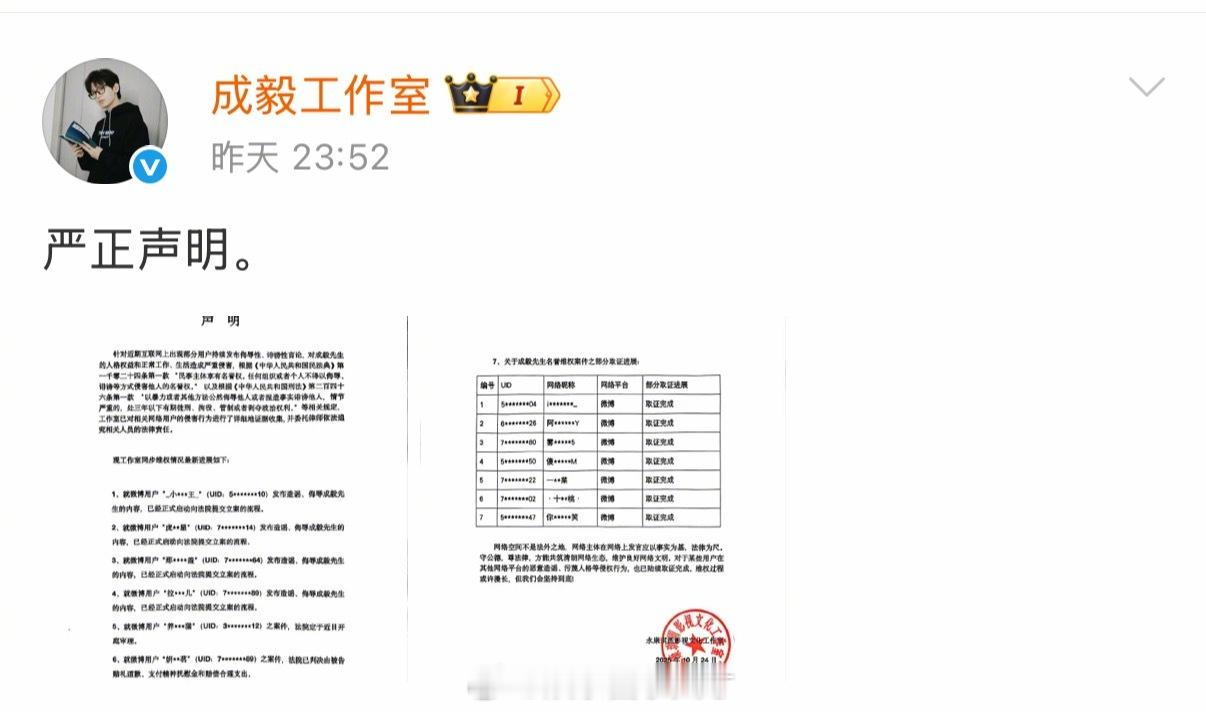 成毅方将维权坚持到底成毅工作室发了维权申明,立案6个,取证7个。