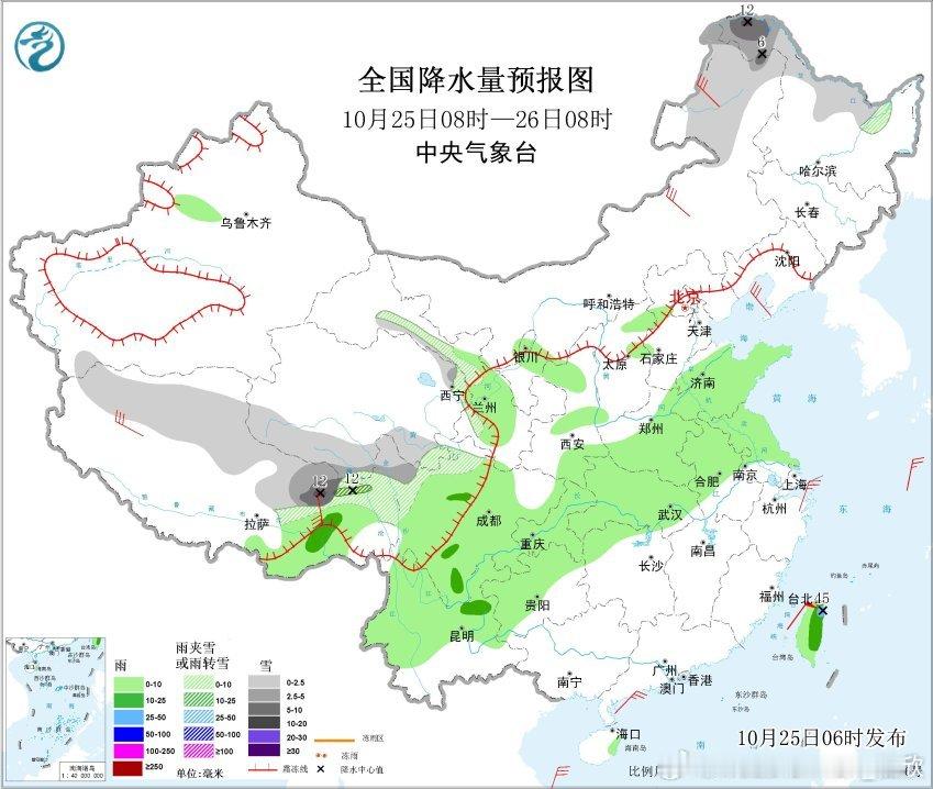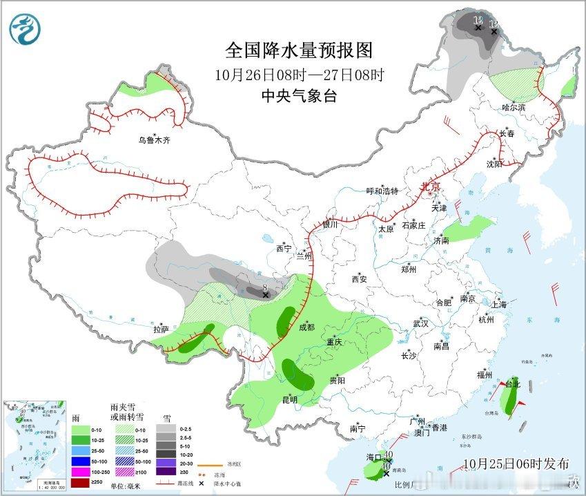 预计10月25日08时至26日08时,内蒙古东北部、黑龙江北部、西藏东部和北部、青海南部和东部、甘肃河西、川西高原北部等地部分地区有小雪或雨夹雪,其中,内蒙古东北部、黑龙江西北部、西藏东部、川西高原北部等地部分地区有中到大雪,黑龙江西北部、西藏东北部等地局地暴雪(10~12毫米)。