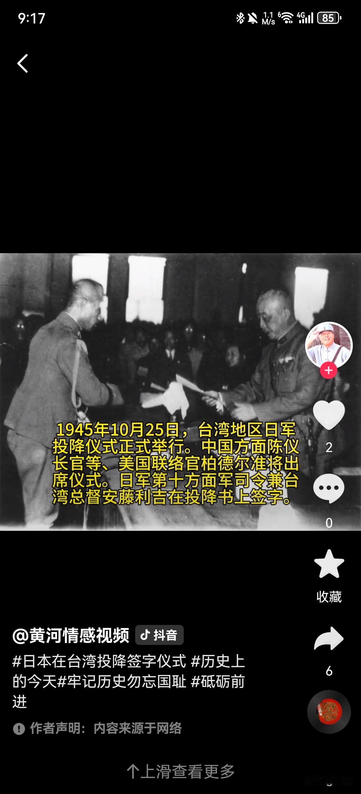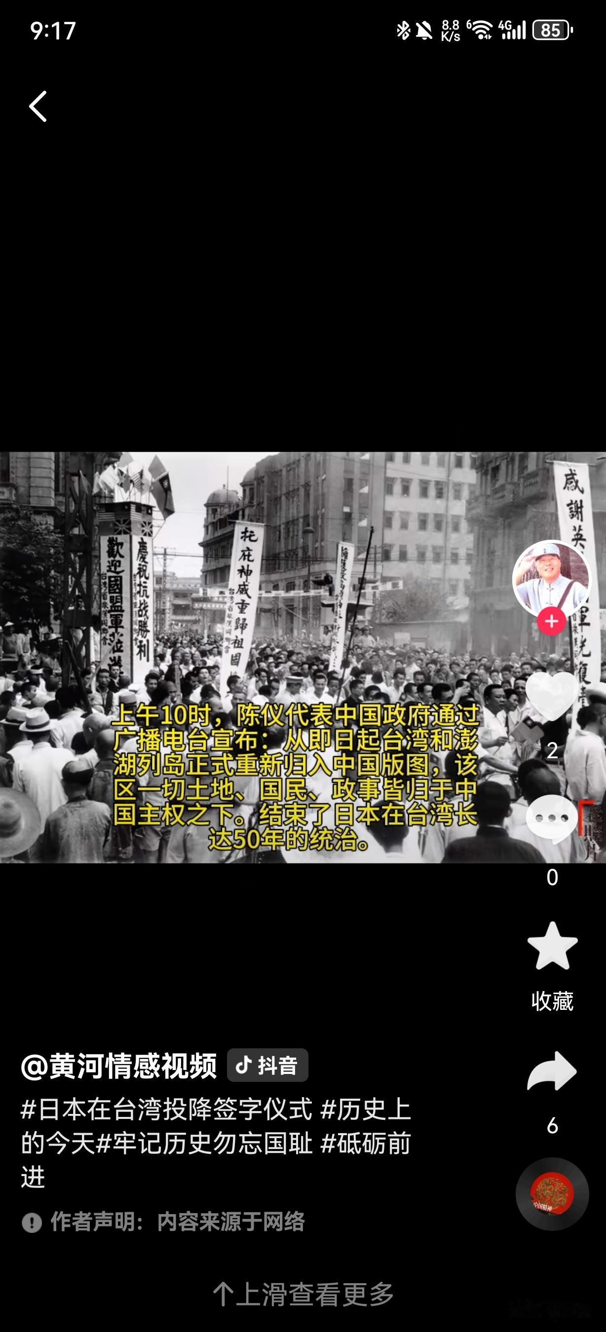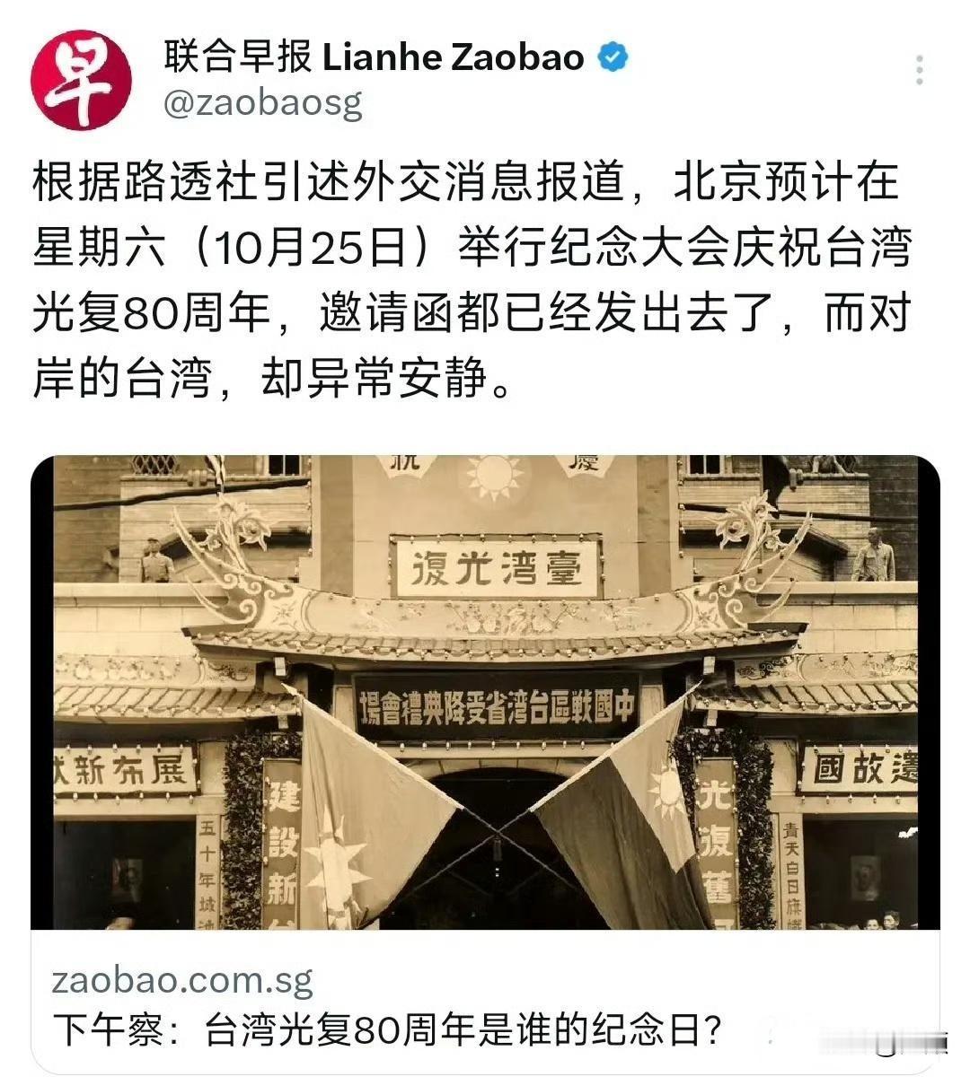1945年10月25日,中国战区台湾省受降典礼在台北公会堂举行,标志着被日本殖民统治50年的台湾及其附属岛屿、澎湖列岛,正式回归中国 。1946年8月,台湾省行政长官公署颁布命令,明定10月25日为"台湾光复节"。 铭记历史 捍卫主权。