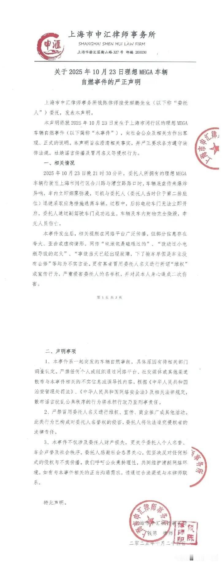 谁看了不慌?理想MEGA 10秒烧成火球,面对网上谣言,沪爷车主甩律师函硬刚,直接把理想的回应按在地上打~ 刚刷到上海那辆理想MEGA的燃爆视频,后背直冒冷汗:正常行驶中底盘突然炸响,10秒内就成了火球,车主连滚带爬从副驾逃出来,车转眼烧成空架子。 更狠的是车主反手甩来律师函,直接把理想的回应按在地上打。官方说"车门顺利打开",实际后排车门根本打不开。 懂车的人一看就猜:这是三元锂电池的典型热失控,而理想MEGA用的正是宁德时代麒麟电池。可理想第一时间先撇责,说"全员安全离车,车门正常",转头就有车友群传谣言:是车主自己磕了电池、改了电瓶还拒修。 没想到碰上个硬茬沪爷。人家不吵不闹,直接找上海市申汇律师事务所发声明,三条就把水泼清:后排车门失效是事实,电池没磕碰是事实,没接任何维修通知也是事实。这操作太懂行了。 先堵死"车主操作不当"的甩锅路,再把焦点拽回车辆本身。要知道这可是50多万的车,买它的大多是冲"家庭安全"去的,要是第三排坐了老人孩子,10秒根本逃不出来。 50多万买辆MPV,图的是家人舒舒服服出行,不是练逃生速度。理想总说"懂家庭",可真到生死关头,后排车门打不开,10秒就爆燃,这哪是懂家庭,是懂怎么踩家庭的安全红线。