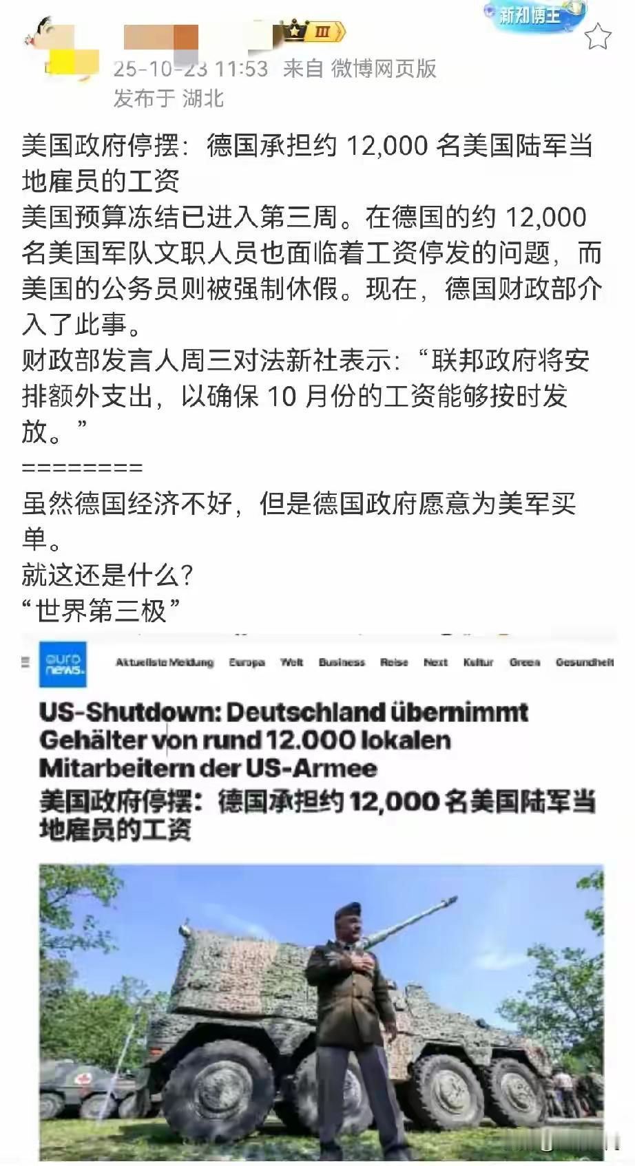特朗普这招高明,成功让德国承担约 12,000名美国在得国驻军陆军地雇员的工资 这次发了一次工资,以后就是发一辈子了,到时候看看驻军不够再过来几仟,不止工资还有吃喝穿住行都要供 特朗普:接下来全球美国士兵工资由所在驻军国家负责承担 。韩国、日本、印度、整个欧洲几十个国家帮忙养美国真是孝顺。