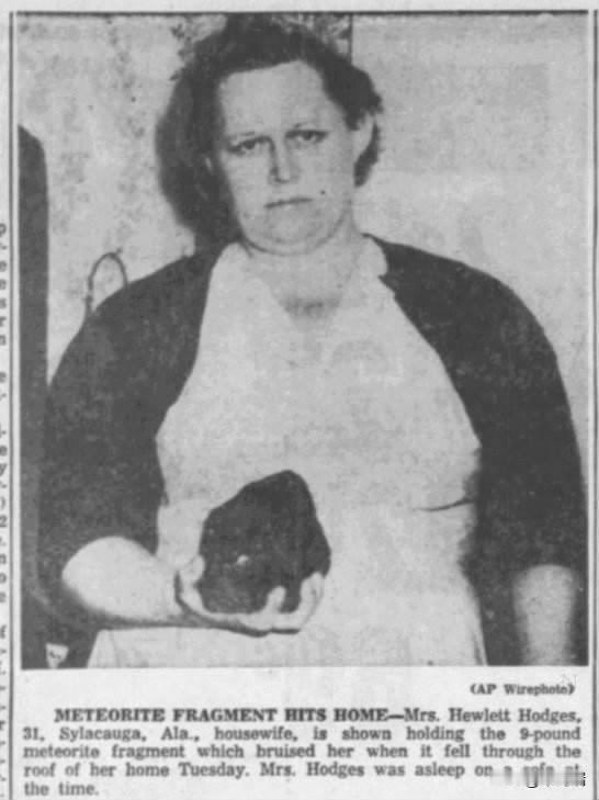 1954年11月30日,美国妇女安·伊丽莎白·福勒·霍奇斯成为有记录以来首位被陨石击中的人。这块重达8.5磅的陨石砸穿了阿拉巴马州锡拉科加市她家的屋顶,撞上收音机后弹回,并在她躺在客厅沙发上小憩时击中了她的臀部。 后来被称为霍奇斯陨石的这颗陨石是一颗葡萄柚大小、重3.86公斤(8磅)的球粒陨石。它是一颗更大的陨石的一部分,在进入大气层时碎裂。尽管这颗流星是在下午早些时候坠落的,但它划过大气层时,三个州都能看到火球。此外,还有空气冲击的迹象,目击者称听到了“爆炸声或巨响”。 34岁的家庭主妇霍奇斯正躺在沙发上盖着被子休息,突然被一个物体击中。撞击导致她的大腿和身体侧面留下了一块葡萄柚大小的严重瘀伤,但除此之外,她没有受伤,还能行走。 这起事件让霍奇斯成了名人,尽管她为人低调,不喜欢受到关注。随后,她与房东伯蒂·盖伊展开了一场法律纠纷。盖伊声称这块陨石属于她,因为它落在了霍奇斯的房产上。经过一年的纠纷,霍奇斯和她的丈夫最终以500美元的价格从房东手中买下了这块陨石。 这段经历以及随之而来的媒体关注严重损害了霍奇斯的精神健康。据报道,她患有精神疾病,此事也导致她的婚姻破裂。她与丈夫于1964年离婚,并于1972年因肾衰竭去世,享年52岁。 霍奇斯对这次经历感到震撼,最终于 1956 年将这块陨石捐赠给了阿拉巴马自然历史博物馆。 尽管还有其他人被陨石击中的说法,但霍奇斯的案例是历史上唯一得到官方证实的案例。