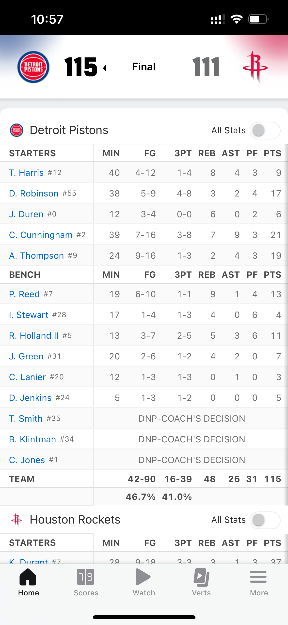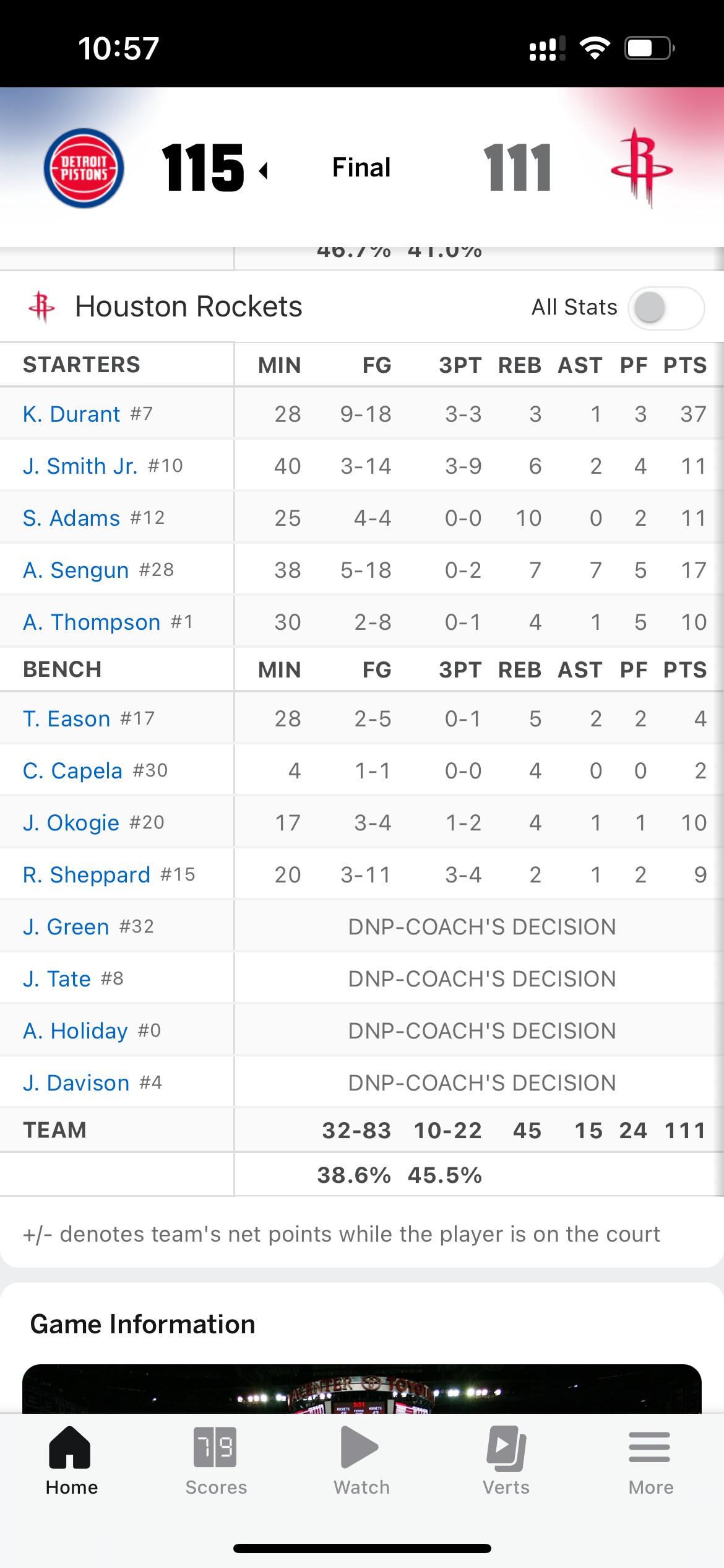 杜兰特37分,火箭不敌活塞两连败