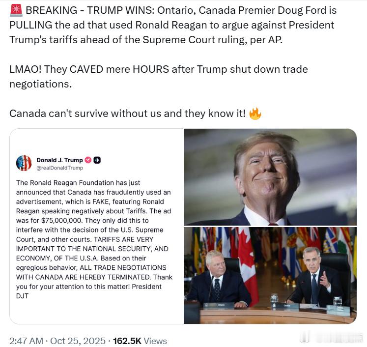 加拿大安大略省省长道格·福特将在最高法院裁决前撤下那支以罗纳德·里根为主角、用来反对特朗普总统关税政策的广告。