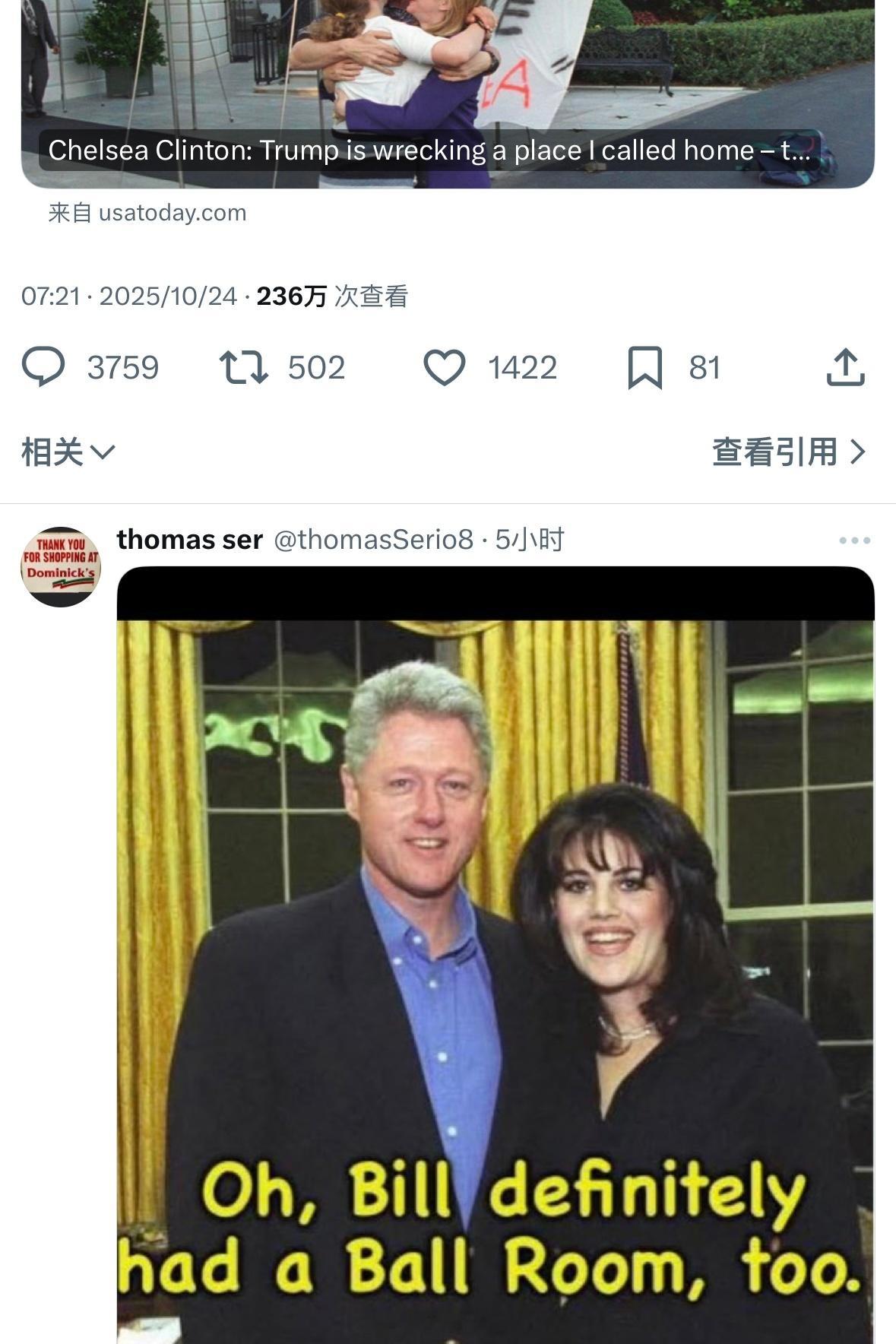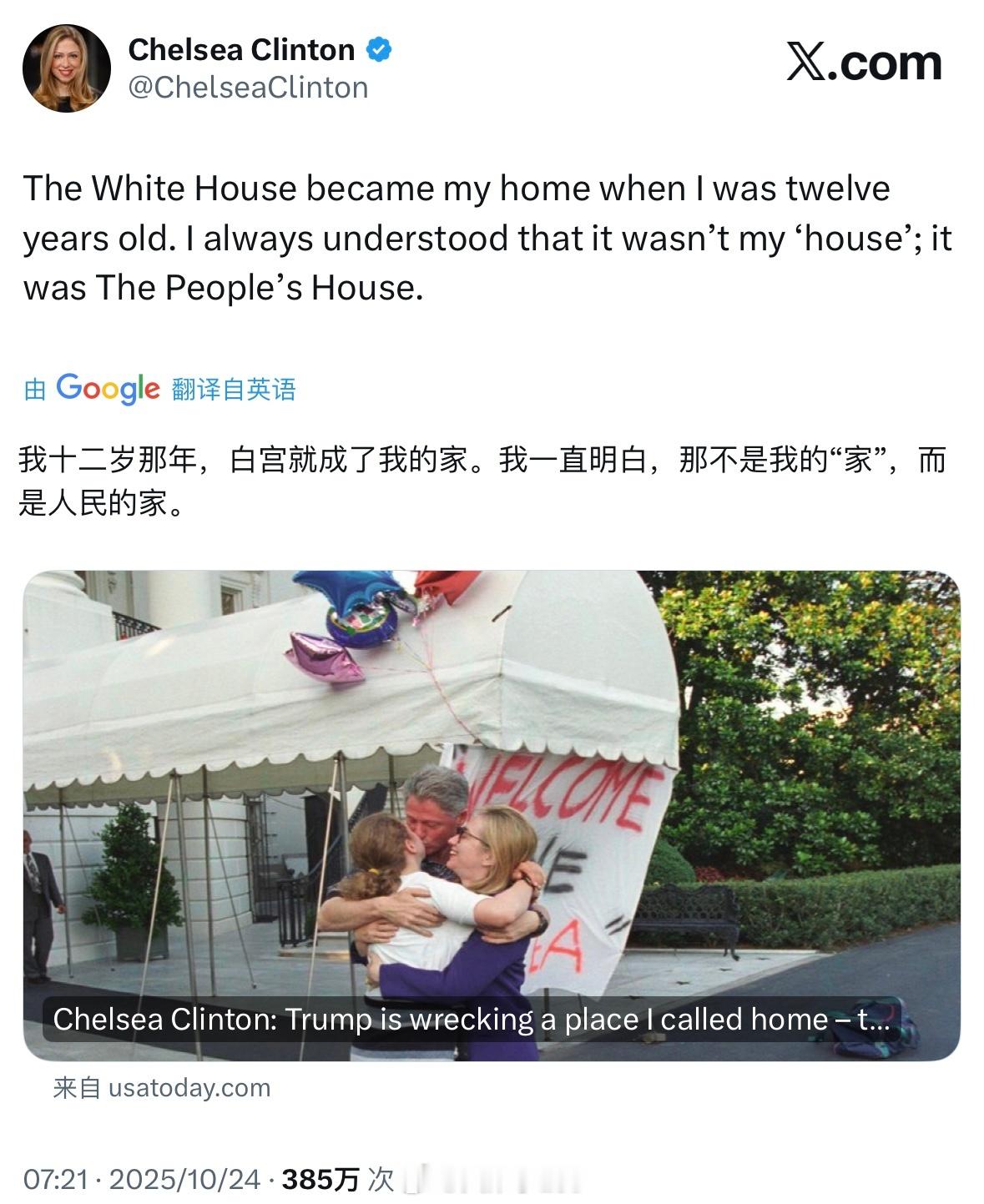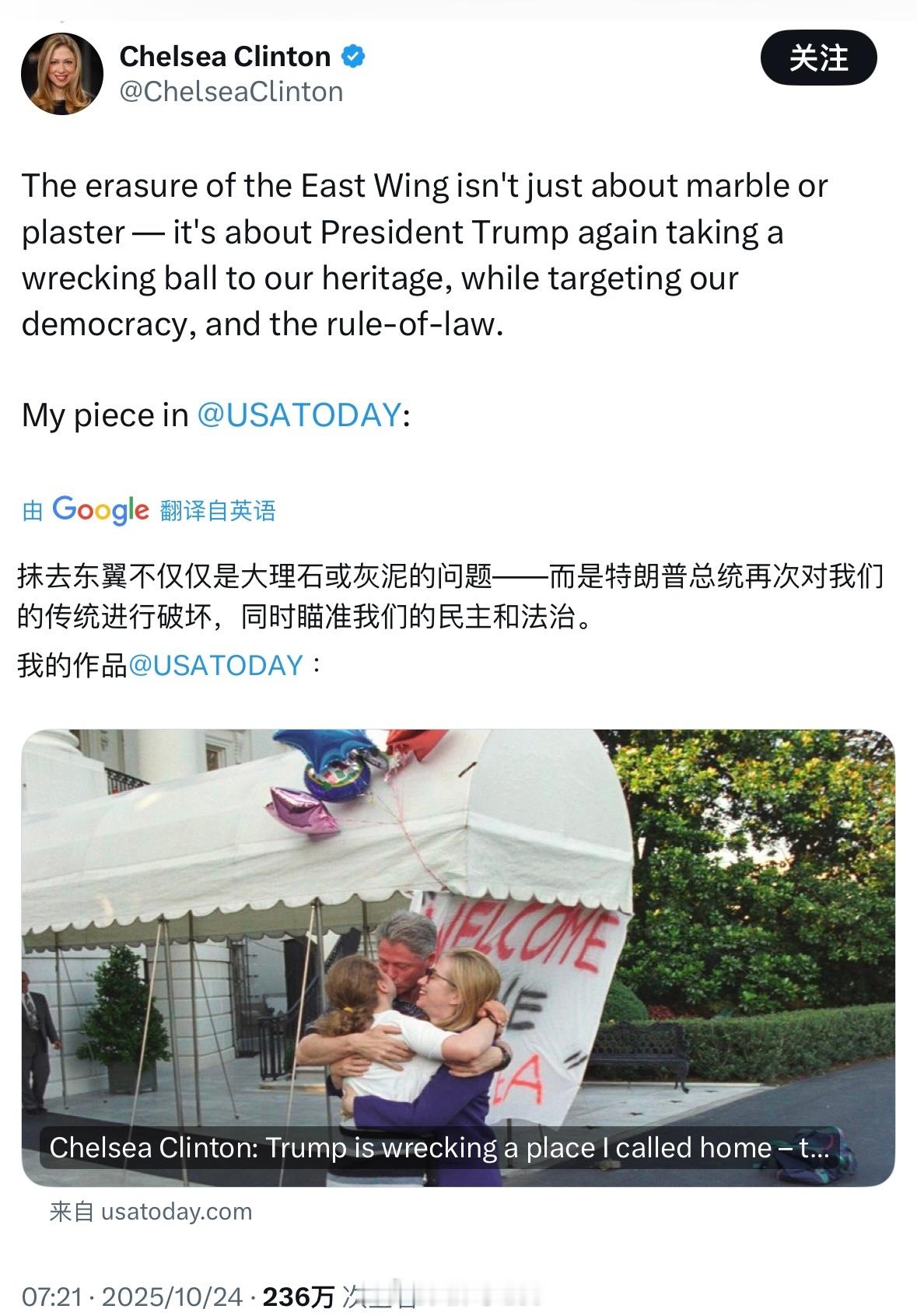 克林顿女儿发文怒斥特朗普拆白宫间接破坏美国的民主和法治
