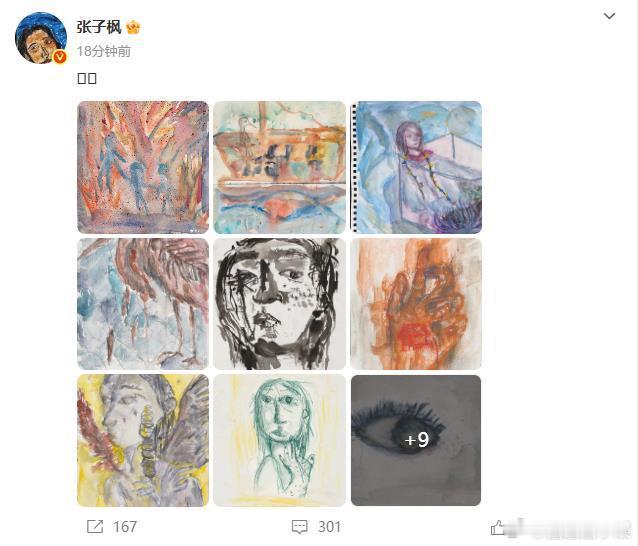 张子枫晒画作张子枫晒出自己画的画作,不懂张子枫的人有难了。张子枫晒19张画作