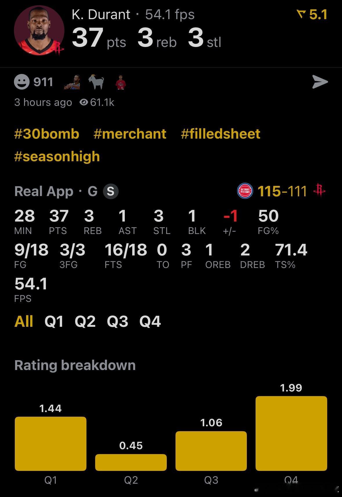 燃尽!!!杜兰特今天出战36分48秒,18中9,其中三分3中3,罚球18中16,得到37分3板1助3抢断1盖帽,正负值-1。