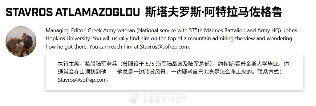 作者斯塔夫罗斯·阿特拉马佐格鲁是一位经验丰富的国防记者,专攻特种作战领域,同时也是希腊陆军退伍军人(曾服役于第 575 海军陆战营及陆军总部)。他拥有约翰斯·霍普金斯大学学士学位及约翰斯·霍普金斯大学高级国际研究学院硕士学位。其作品曾发表于《商业内幕》、《沙盒》及《特种作战报告》等媒体。