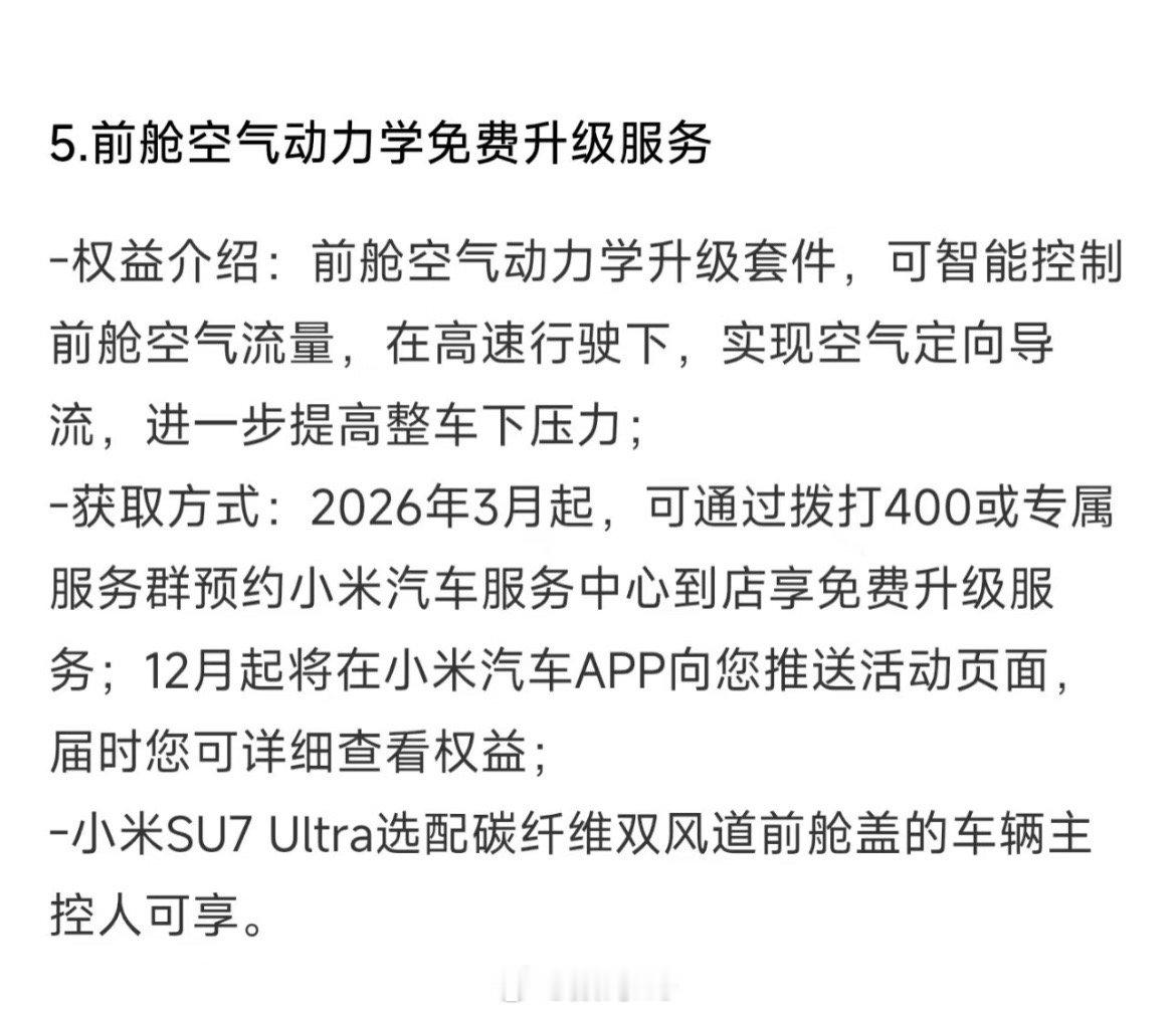 小米su7ultra 前舱空气动力学免费升级,划重点根据速度提供进风量,实现空气定向导流,进一步提高整车下压力。